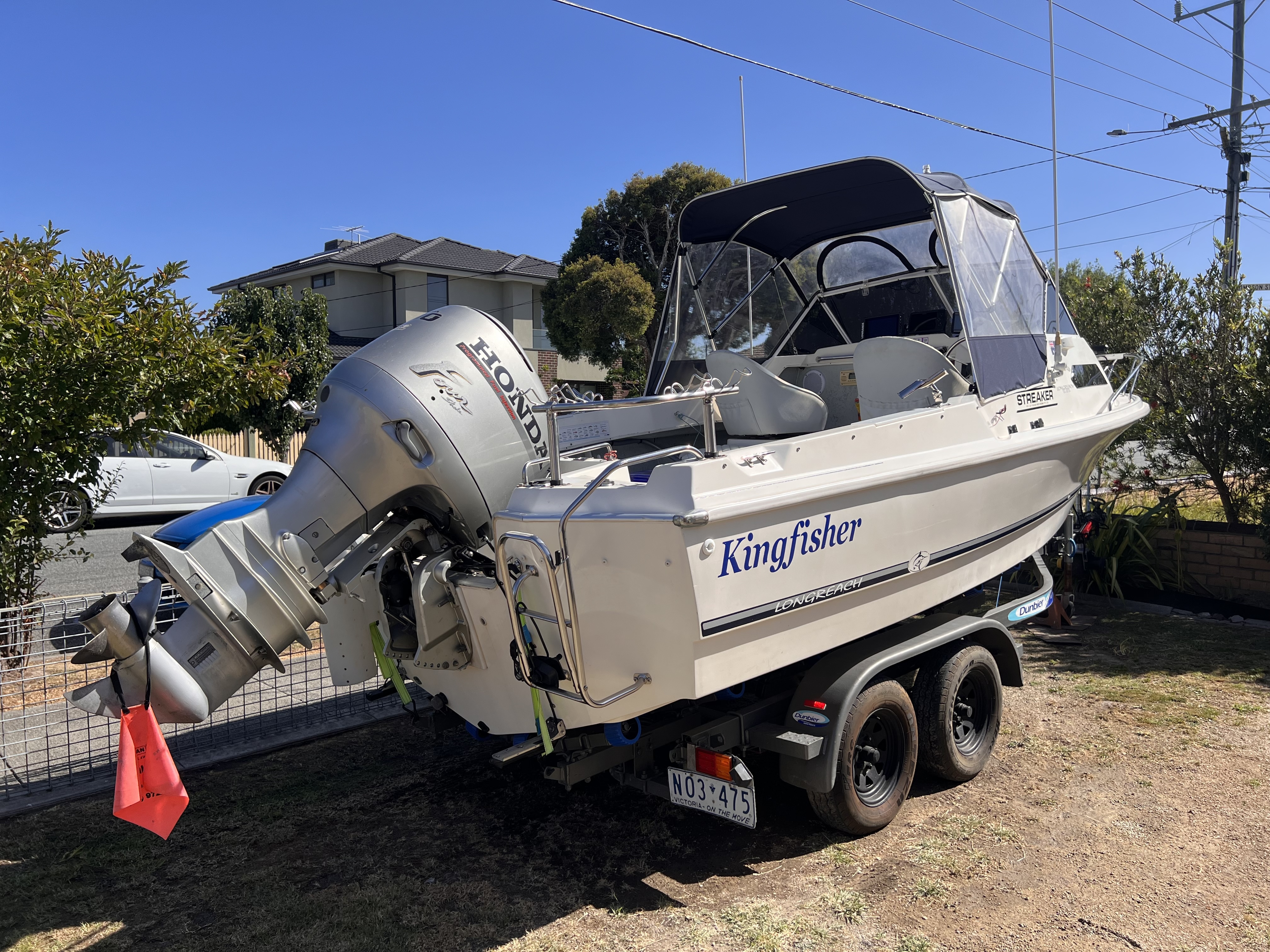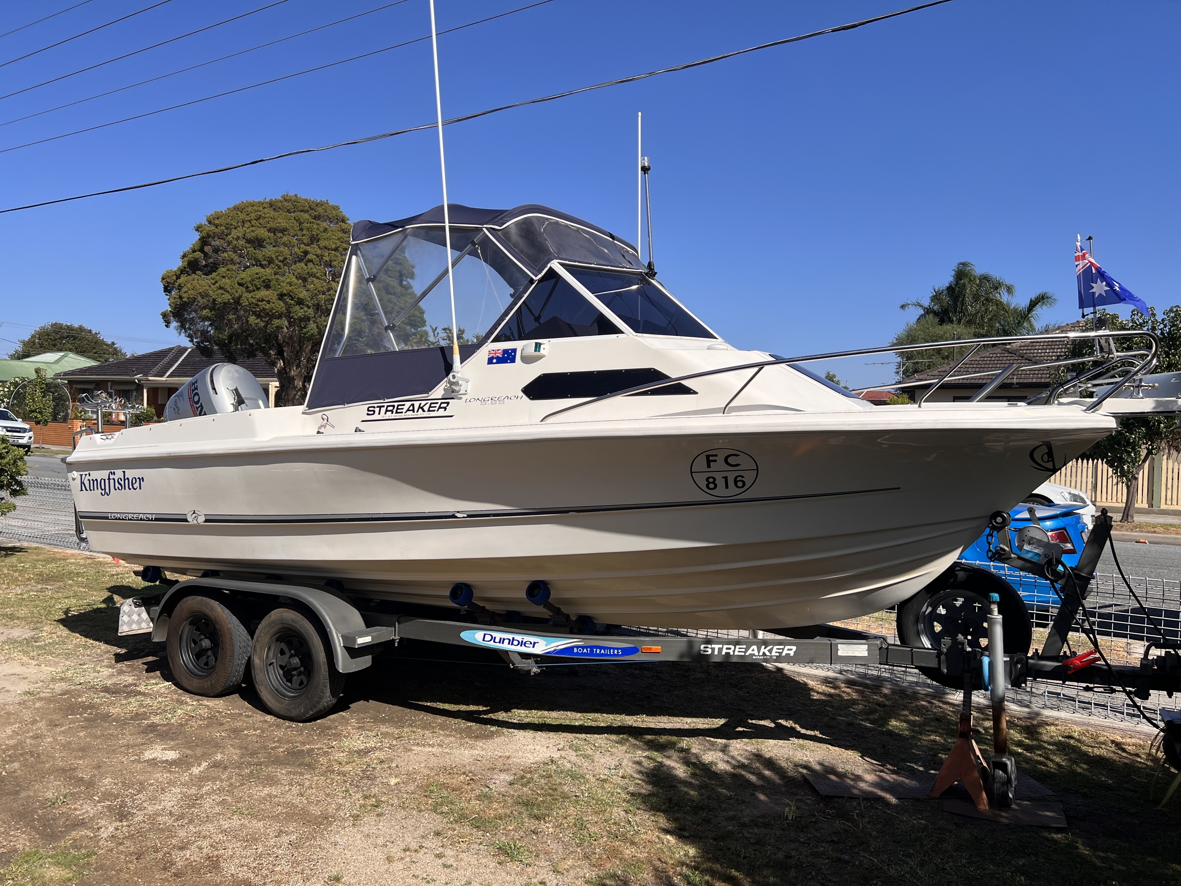 Selling my 1999 Savage Streaker 5.85m Longreach Boat has been my pride and joy, selling due to purchasing caravan and needing additional storage space. Boat and trailer both currently registered in Victoria (October 2024). Very clean and tidy throughout, with recently replaced windscreens, canvas bimini cover. Stainless steel rod holders, bait board, upright rod holders. Honda 130hp 4 stroke engine, always serviced at JV marine in Braeside. New hydraulic steering, dual batteries with isolator. Near new Savwinch electric anchor with stainless steel bow spit. Inside the lock up half cabin (with key) there is seating area, toilet and plenty of dry storage. Live bait tank, seating for 5 outside. bilge pump, esky. Seats recently reupholstered with diamond stitch. Trailer recently refurbished, new wheel bearings, paint & rollers. Spare wheel on trailer. Viewing available in Noble Park VIC 3174. Very good reliable and clean boat, ready to enjoy with your family. Can provide video of boat started and running.