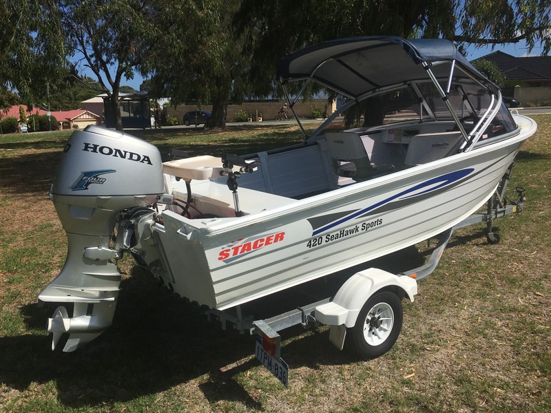 4.2m Stacer “420 Seahawk Sports” aluminium runabout and it’s all in absolute immaculate condition throughout. Features Plush upholstered swivel bucket seats, carpeted, walk thru windscreen, Folding Bimini, Humminbird GPS/Sounder, Alpine stereo, Nav lights, Bilge pump, Bait board, Rod holders, Twin fuel tanks, H/duty Battery and much more.
