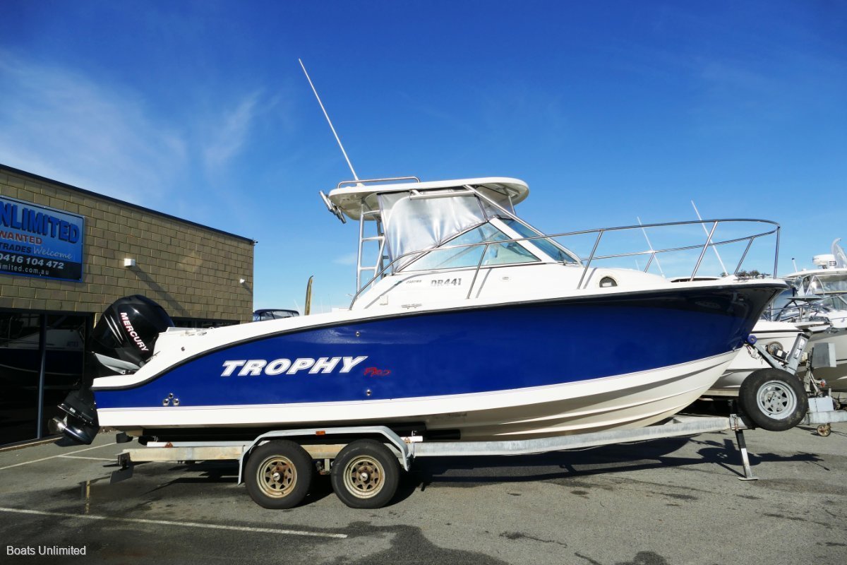 TROPHY 2502 WALKAROUND OFFSHORE FISHING // FAMILY // ALL ROUNDER Although designed as a fishing boat, the cabin aboard this boat makes it a very versatile weekenderBuilt for going out wide, the big Trophy 2502 Walkaround has all the bells and whistles for fishing offshore, plus double as a family weekender. With a history of building boats stretching over many decades, the Trophy range has certainly come a long way to where they stand today. Formerly the butt of many jokes, the Trophy brand is now the market leader in their class, and provides a well built product, likely to provide many trouble free years of boating. As with most of today's top manufacturers, all Trophy boats are designed using the CAD (Computer Aided Design) system, which is the most accurate and efficient method to build a boat available today. The Trophy 2502WA is built using an all-fibreglass stringer system. The one-piece rigid framework of stringers is bonded to the hull and deck while it is still in the mould, helping to avoid flex in the hull and create a solid one-piece structure. The US manufacturers, such as Trophy, are leaps and bounds ahead of most in regards to finish and fittings. The small things such as a light in the livebait tank, transom workstation including sink and freshwater, purpose built icebox, separate battery isolator panel, substantial stainless steel deck fittings (such as oversized cleats), oversized windscreen wipers, and much more proves the boat is designed to do the job. Fishing is what this boat is all about. When stepping aboard the non-skid self-draining cockpit, even the fussiest of buyers will be impressed. With a massive cockpit area and a rear transom fishing station, a setup like this has been dreamt about by anglers for many years. The transom consists of a fold-up rear lounge, a removable cutting table and purpose-built bin in the starboard side to accommodate a large icebox, centrally mounted 113lt plumbed livebait tank with light, and a sink with freshwater tap and deck door to port. Access to the batteries and battery switch is very simple through separate access hatches. The sidedecks are wide and have two rodholders and two drinkholders mounted in either side. More rod storage is also located in the sidedecks of the cockpit, in the cabin, and also up on the hardtop. The cockpit is surrounded by coaming bolsters to make bracing against the side of the boat comfortable in a hard fight. and heaps more...