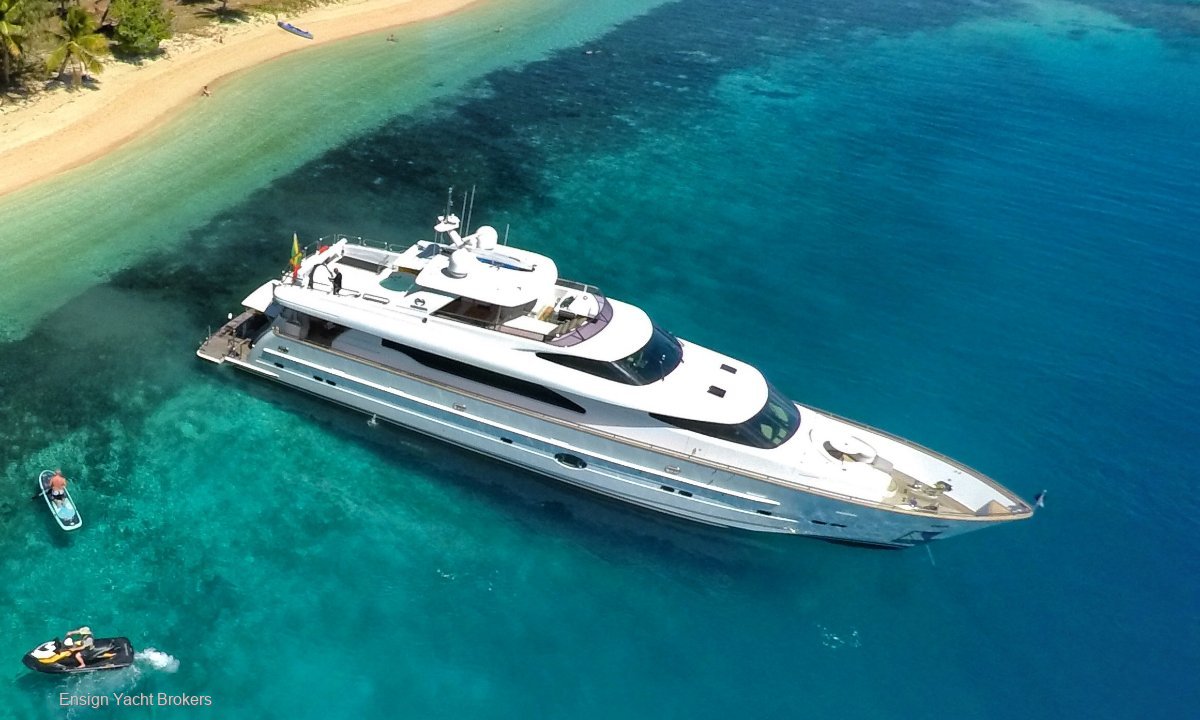 Ensign Yacht Brokers are proud to present this exceptional Horizon 97' Motor Yacht. The vessel is both an owner's and entertainer's dream. It features the ideal combination of formal luxury and casual elegance to create the perfect solution to an investment in one's lifestyle. The spacious saloon includes a beautiful bar at entry that will likely have you questioning the need to venture elsewhere. In addition to this there is a formal lounge and dining zone with exceptional views along with a galley forward featuring casual dining zone that also offers excellent views. The galley forward option is highly sought as it is more suitable to owners use as opposed to typical crew serviced galleys far more commercial in application. Outdoor entertaining is well catered for with an alfresco dining deck leading aft of the saloon, customised flybridge boasting comfortable lounge and casual sun lounges along with wet bar and Jacuzzi for complete relaxation and enjoyment. Accommodation is stunning with feature satin oak timbers and luxurious leathers throughout the entire level. A beautiful full beam mid-ships Owners stateroom is well complimented with guest VIP stateroom forward and 2 additional luxury cabins offering 2 berths each. A separate crew zone comprises 2 cabins and lounge area. Mechanically the vessel is well appointed with dual Caterpillar C32's and 15,500 litre fuel capacity to offer range further then most. The twin Onan 27KVA gensets are getting high on hours, so the owner has agreed to replace with brand new gensets as part of the deal. A professional maintenance schedule see's oil samples regularly taken and engines serviced every 250 hours leaving them very sound. The vessel has been lift and antifouled October 2019.As a Jamaican flagged vessel, the vessel is being sold off shore with no GST or duties paid. Currently lying in Tahiti, this vessel is ideal to cruise around the South Pacific and enjoy island life on a grand scale. The vessel also enjoys a boutique charter income which could continue should the new owner's desire. Please contact to arrange an inspection.