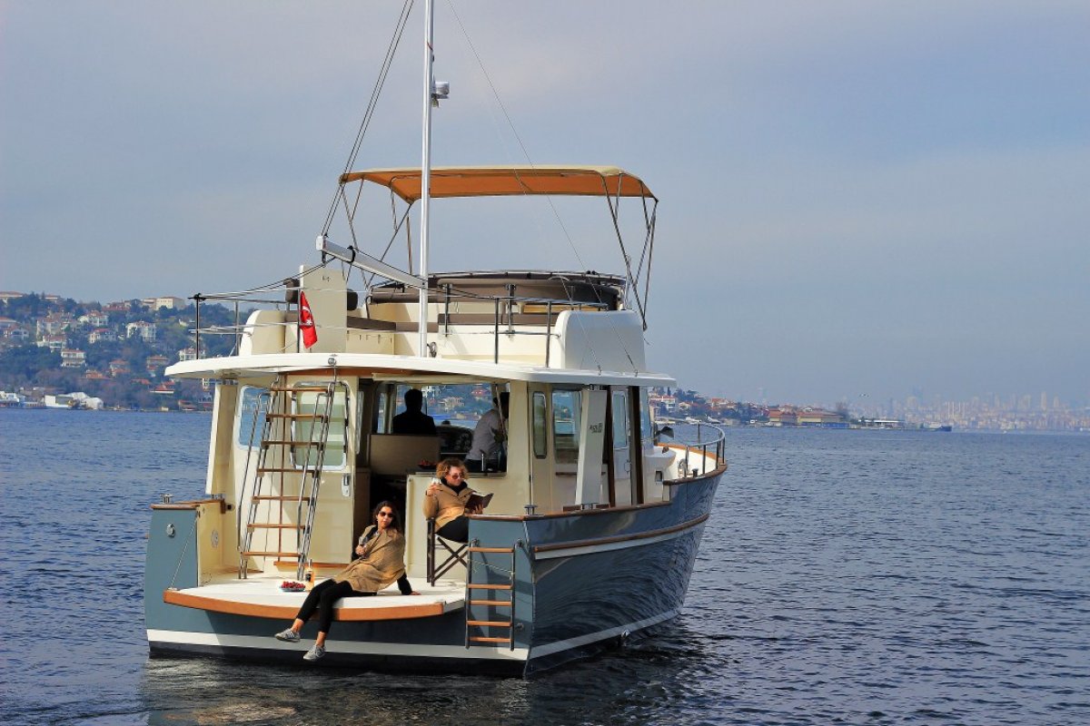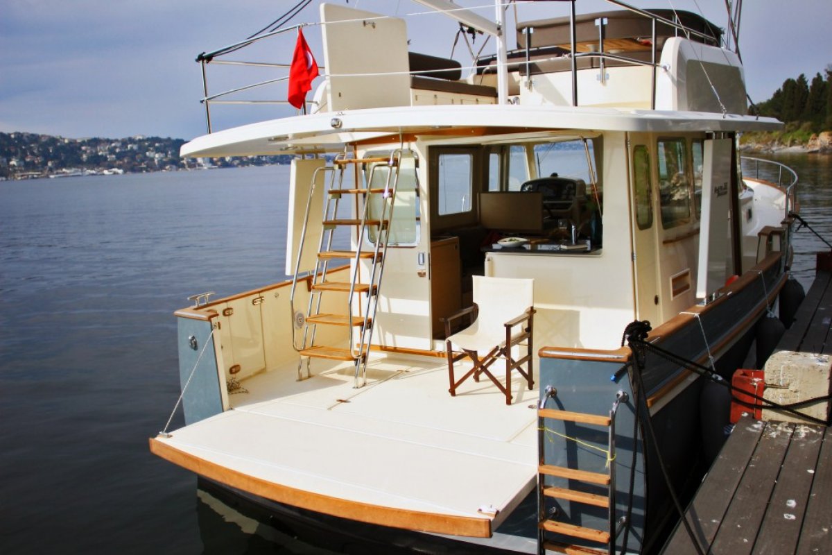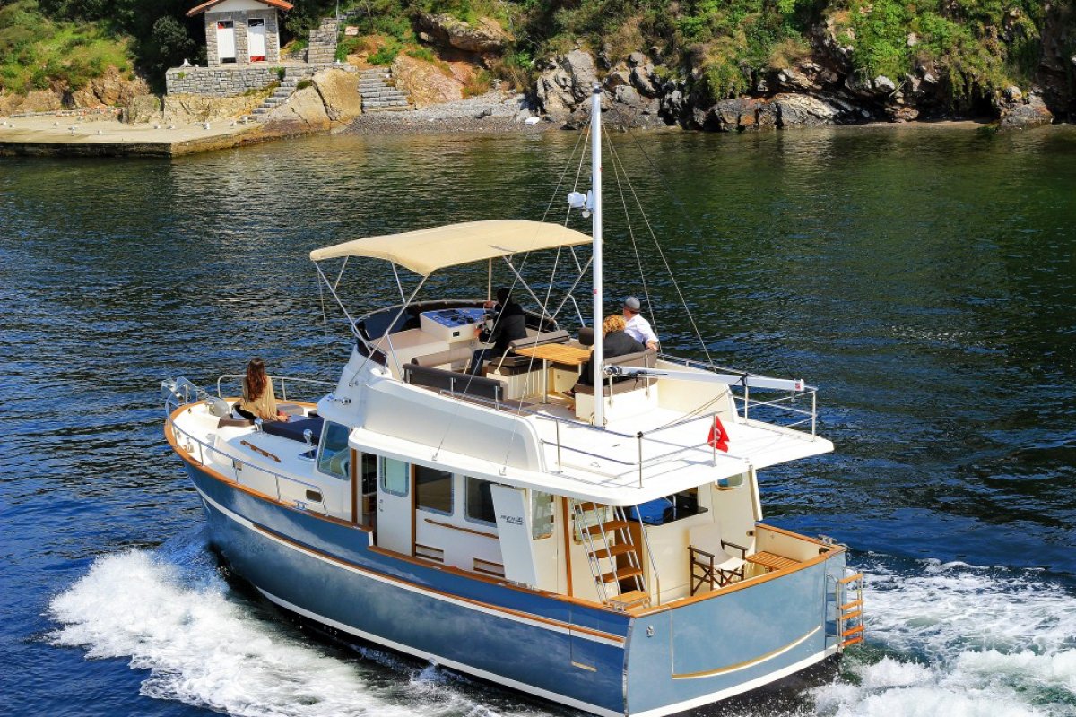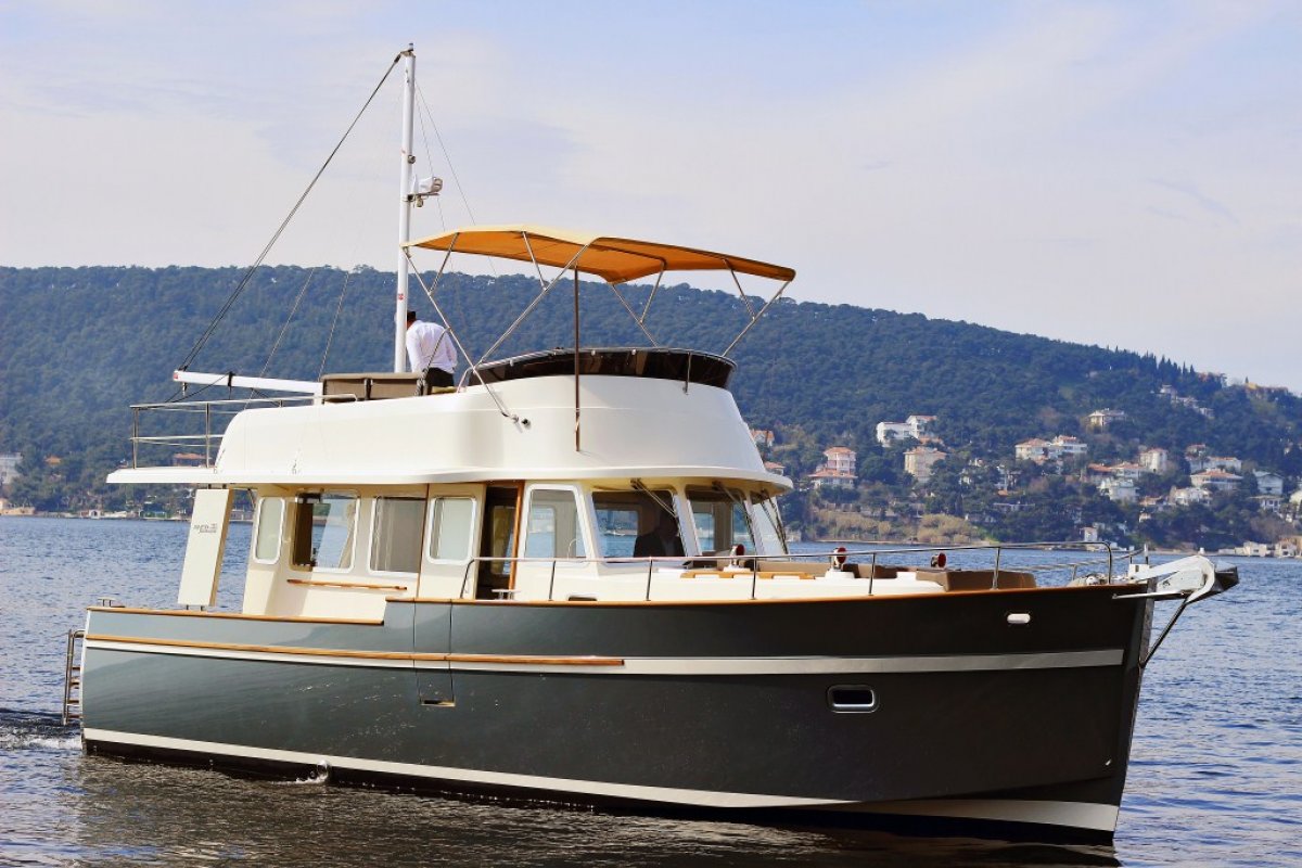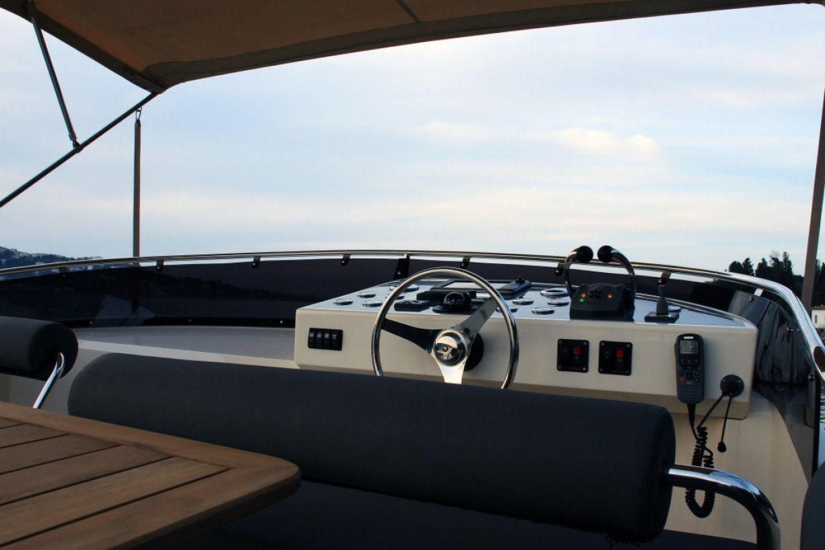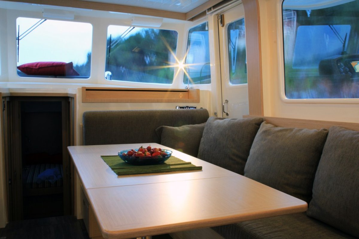 Rhéa Trawler launched there 36 ' in the same lineage as the Trawler 43: Very seaworthy, comfortable at sea and elegant. In short, boats made for sailing and tackling difficult seas. This high quality Trawler from Rhea is like all the others: They are extensively personnalisable and you can bring the boat at the highest level of options and modifications you want. This 36 footer already featured Wide gangways - 2 side doors - 2 big double cabins - 1 common bathroom with a separate shower: A galley looking onto the cockpit - A big saloon with the starboard part convertible in passenger seats with view facing the front - Pilot and co-pilot seats - Sofa bed. Flybridge with cockpit for 2 persons + a bench for 2 persons facing the front - A big saloon with a table for 6 persons - Cargo boom for dinguy. With 1000 liters of diesel, she is the perfect boat to cruise the coast in comfort and security.