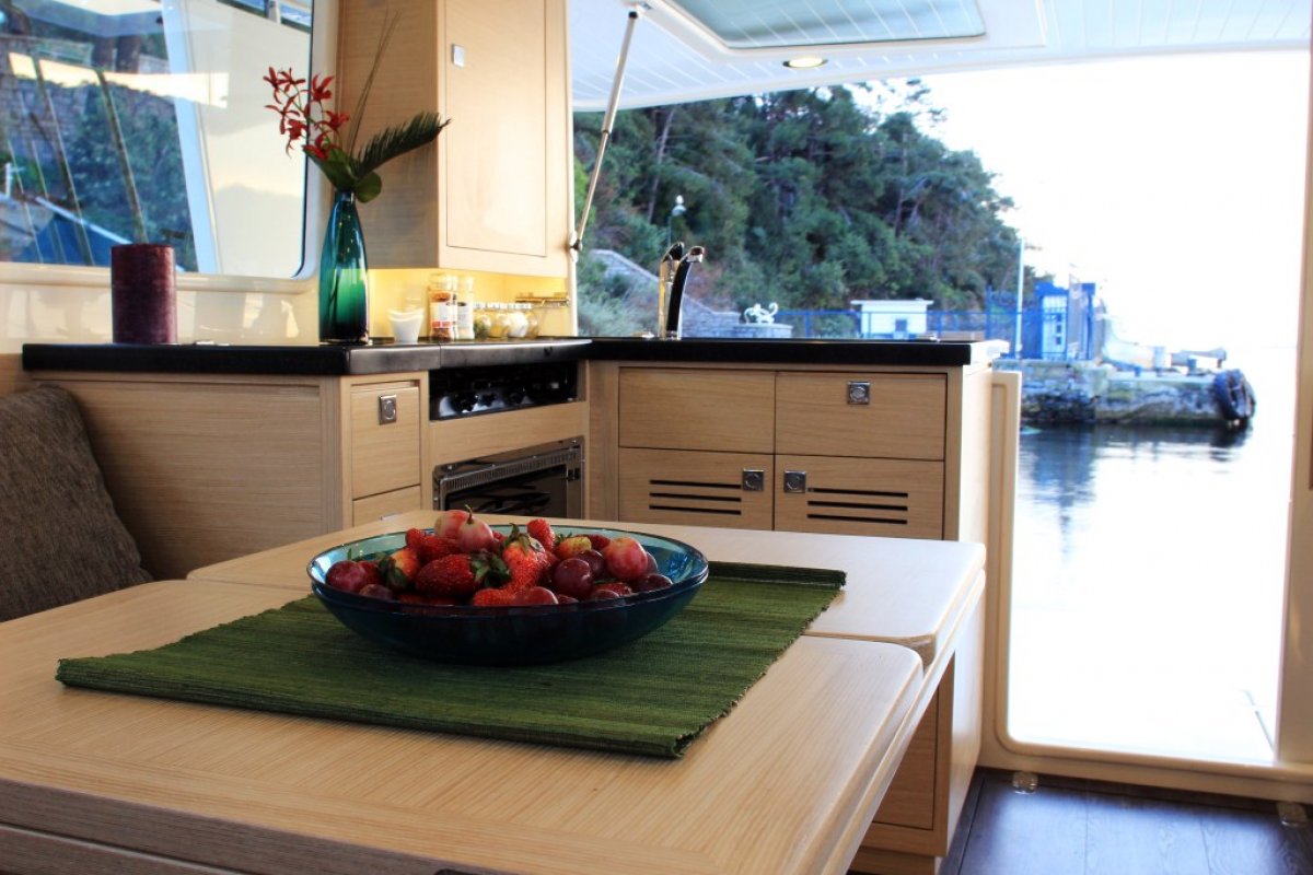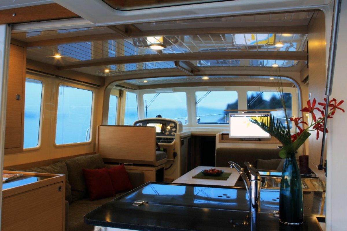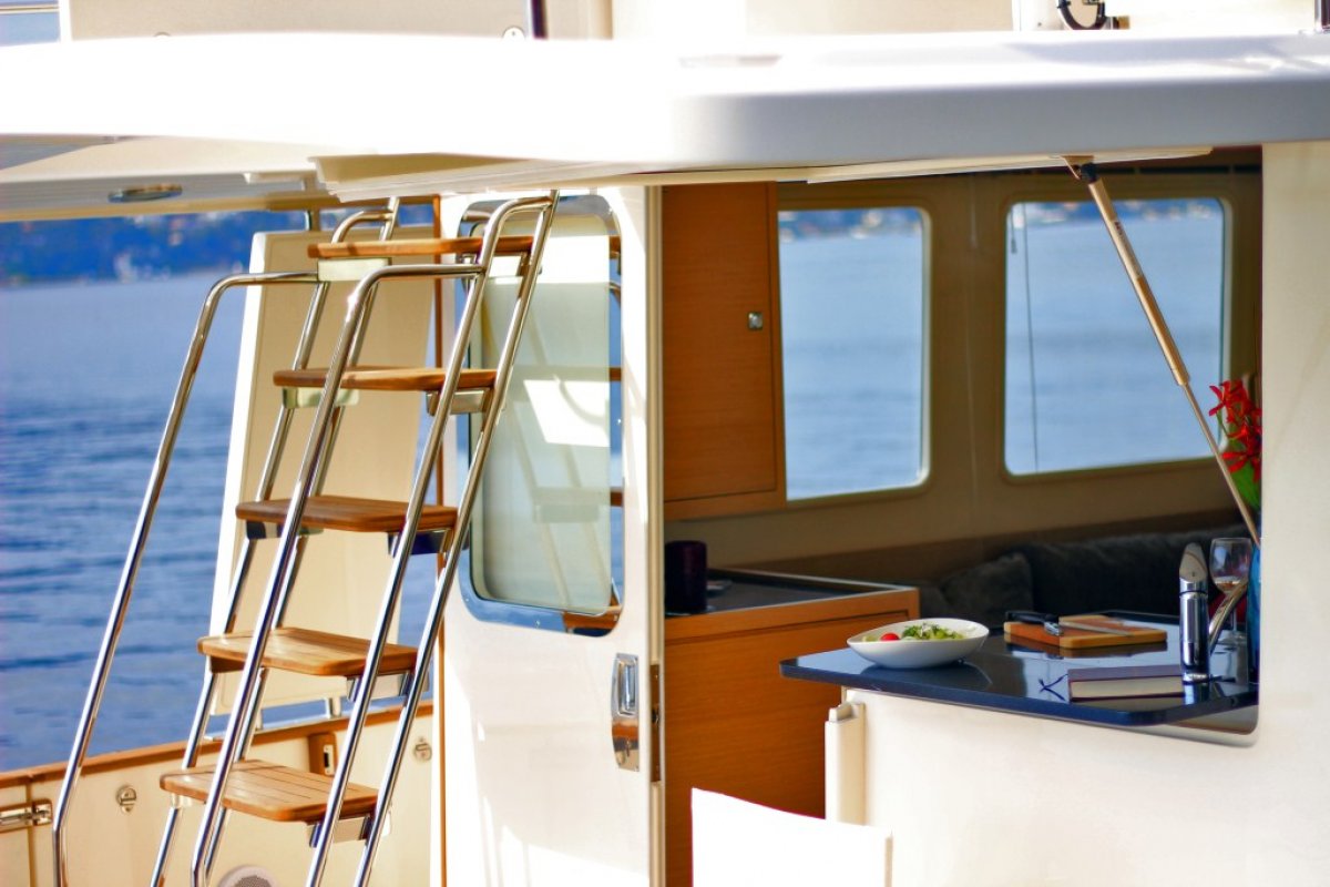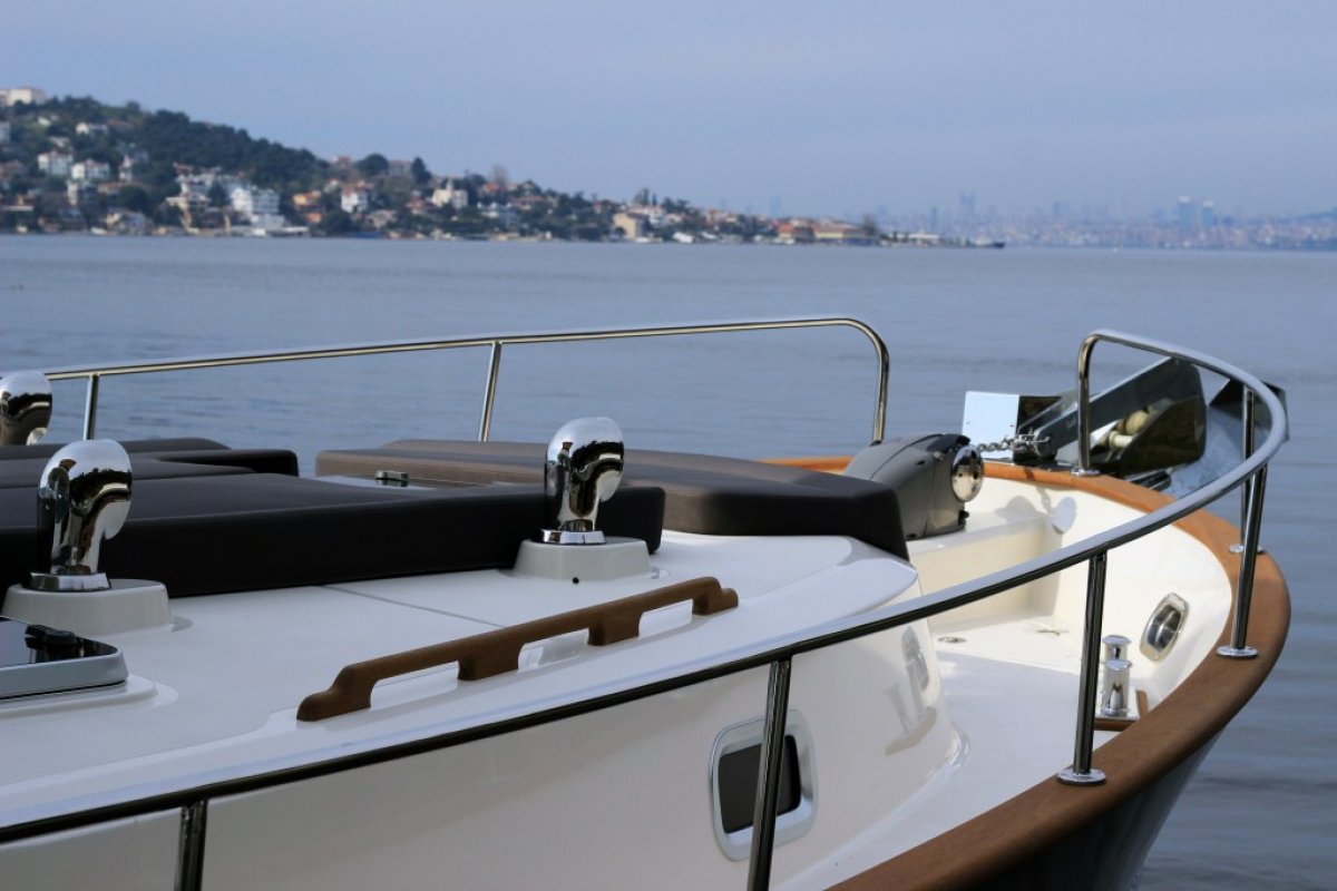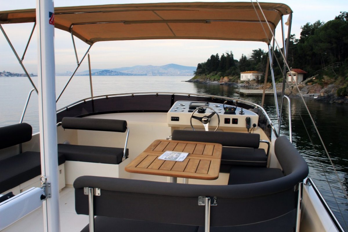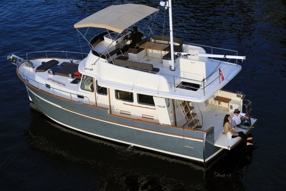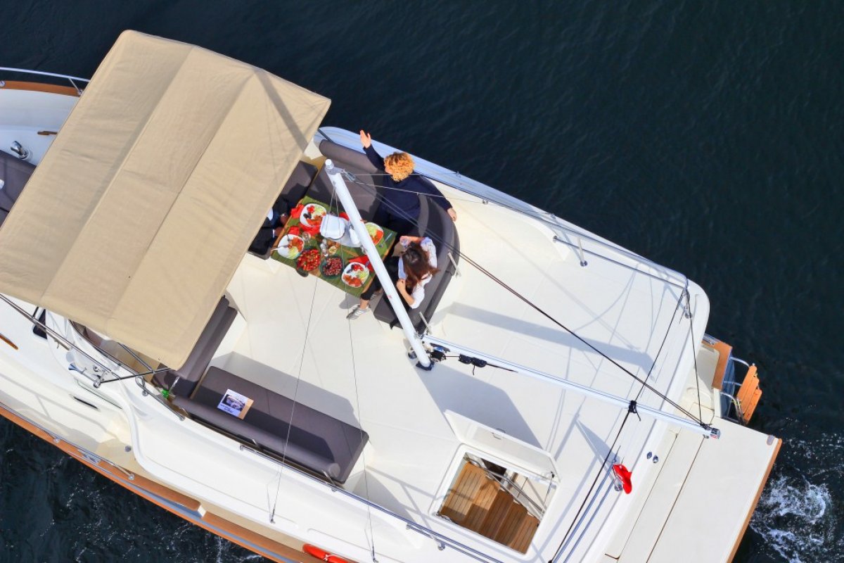 Rhéa Trawler launched there 36 ' in the same lineage as the Trawler 43: Very seaworthy, comfortable at sea and elegant. In short, boats made for sailing and tackling difficult seas. This high quality Trawler from Rhea is like all the others: They are extensively personnalisable and you can bring the boat at the highest level of options and modifications you want. This 36 footer already featured Wide gangways - 2 side doors - 2 big double cabins - 1 common bathroom with a separate shower: A galley looking onto the cockpit - A big saloon with the starboard part convertible in passenger seats with view facing the front - Pilot and co-pilot seats - Sofa bed. Flybridge with cockpit for 2 persons + a bench for 2 persons facing the front - A big saloon with a table for 6 persons - Cargo boom for dinguy. With 1000 liters of diesel, she is the perfect boat to cruise the coast in comfort and security.