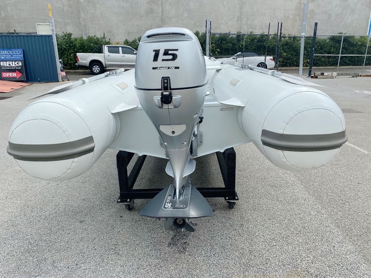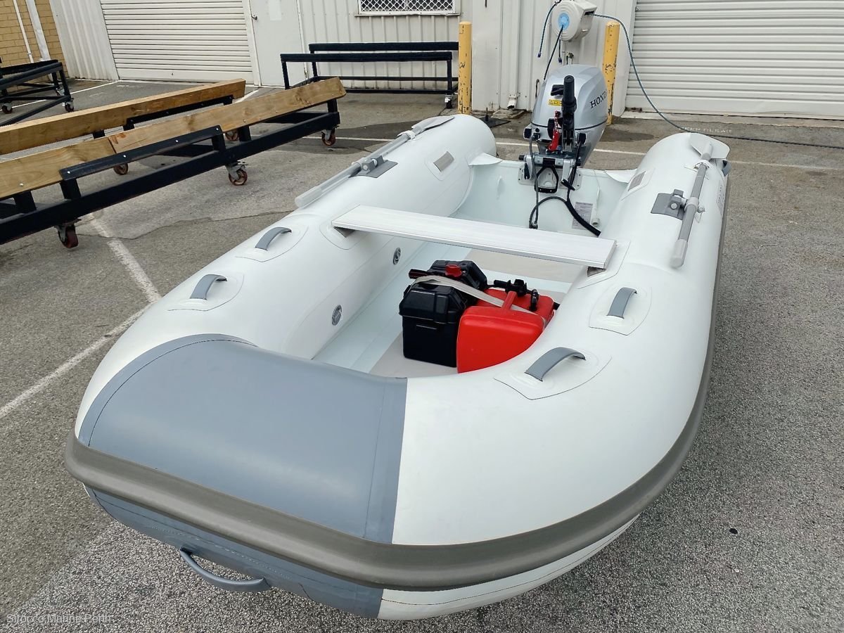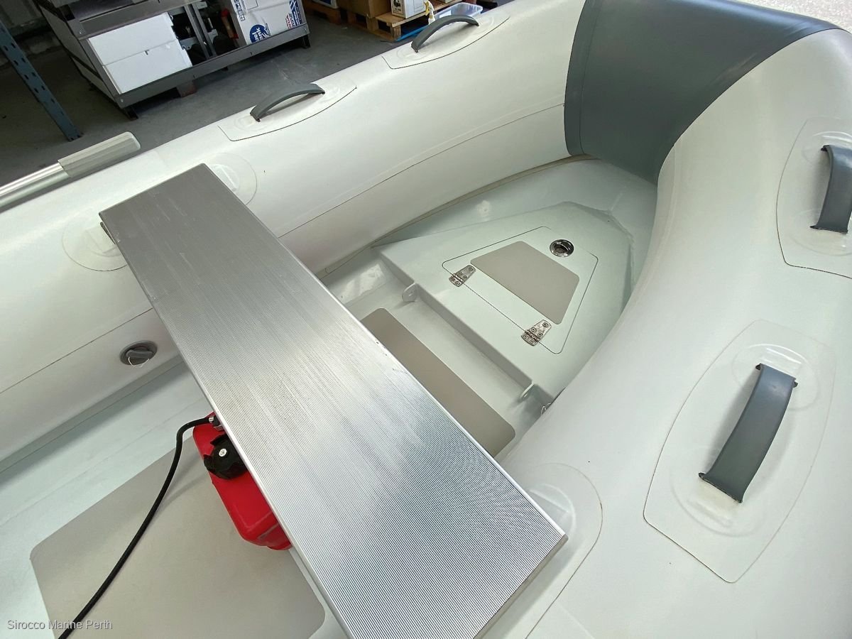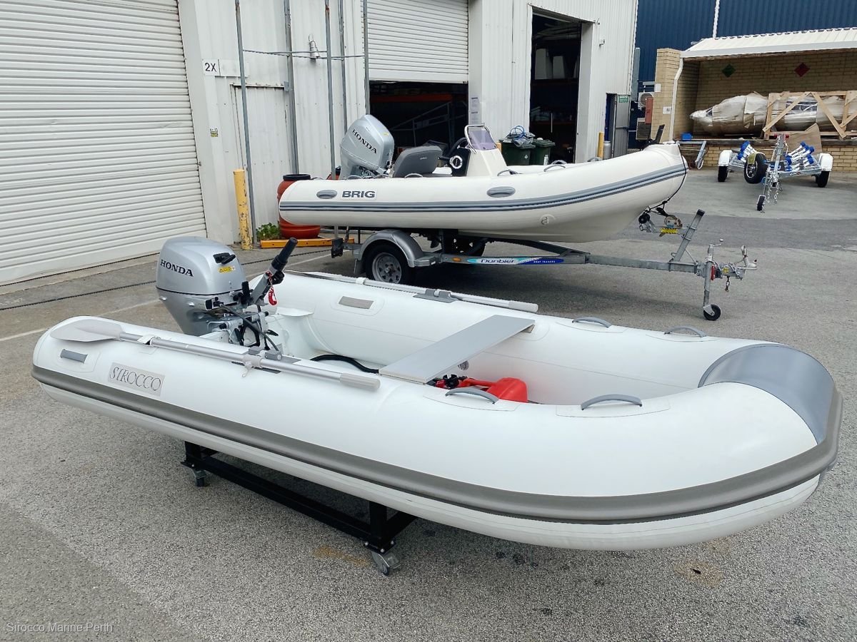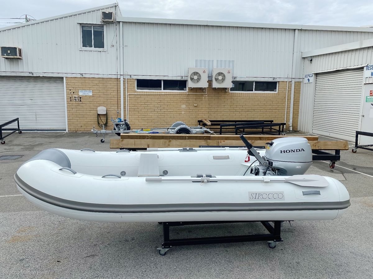 Just traded: 2018 Sirocco 3.1m alloy hull RIB with ORCA Hypalon tubes, supplied with 2019 model Honda 15hp 4-stroke electric start gas tilt outboard. Last chance to secure a 3.1 Alloy hull Sirocco RIB, we've sold out of new stock! Hull was sold new only 6 months ago. Supplied with 10L fuel tank, fuel line, SE Sport hydrofoil, battery, battery box, alloy paddle kit, 2 x alloy bench seats, high pressure foot pump, boat bag and overall cover. SIROCCO Alloy RIB tenders offer the benefits of a completely flat cockpit floor, with the weight saving and strength of an aluminium hull. Made from ORCA® Hypalon, these RIBs feature large diameter tubes, stainless steel towing eyes (tubes), welded lifting points, pinned oar row locks, extra heavy transom, bow locker and multiple buoyancy chambers. Length: 3.1mWidth: 1.55mWeight: 58kg (hull only)Max HP: 20Load Capacity: 490kgNo. Seats: 2Max Persons: 4.5------------------------------- -------------------------------------- -----------------CONTACT YOUR LOCAL DEALER, SIROCCO MARINE PERTHStewart DixonMobile: 0499 887 072Office: 08 6102 4414stewart@siroccomarineperth. Com. Auwww. Siroccomarineperth. Com. AuSirocco Marine Perth20 Mews Road (next to The Boathouse)South FremantleWestern Australia 6162