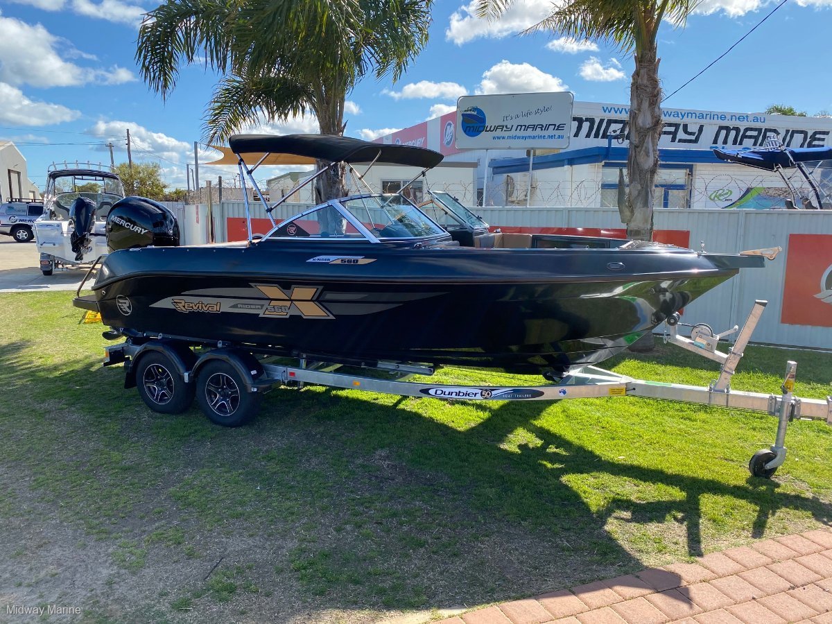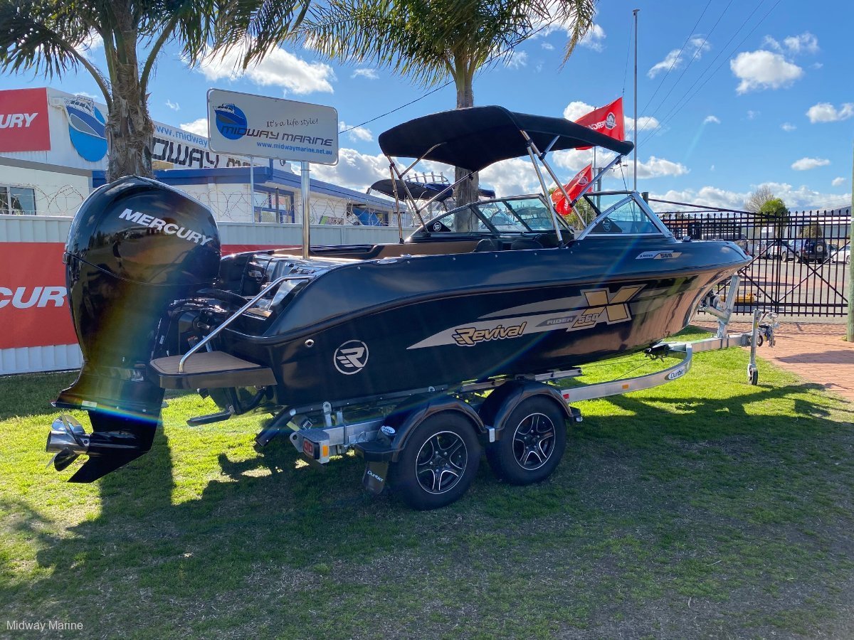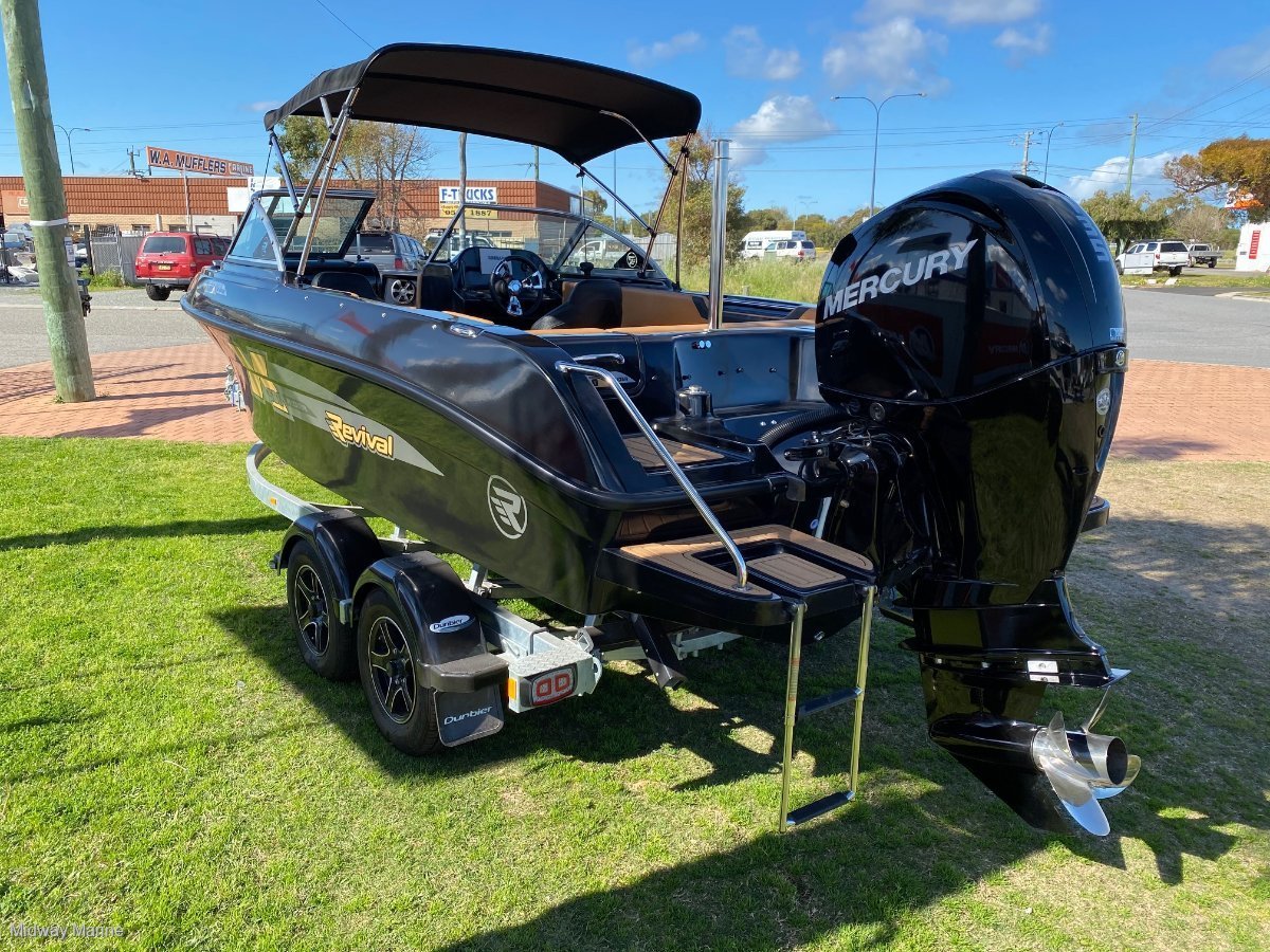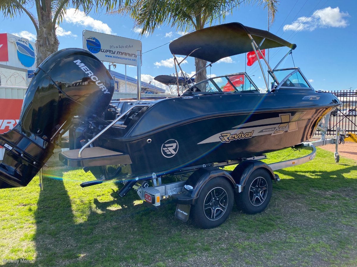 THE STEALTH EDITION!!!. CHECK OUT THIS FROM THE REVIVAL RANGE OF BOATS, THIS PERFORMS AS GOOD AS IT LOOKS, FROM CRUISING THE WATERWAYS, TO A DAY ON THE WATER, TOWING SKIERS OR BISCUITS, OR EVEN GO OUT FOR A DAYS FISHING, THIS WILL DO IT ALL, HEAPS OF SEATING FOR FAMILY AND FRIENDS, EASY TO TOW AND LAUNCH BEHIND MOST FAMILY CARS. REVIVAL 560 X-RIDERMERCURY 135HP EFI 4/STROKE OUTBOARD IS A GOOD FITHYDRAULIC STEERINGDUNBIER DUAL AXLE BRAKED TRAILER WITH BLACK KNIGHT WHEELSBIMINI AND SOCKTRAVEL COVERBOW COVERDELUXE INTERIORWAKEBOARD/SKI LOCKERRUBBER TEAK FLOORINGREMOVABLE SKI POLEREAR SWIM PLATFORMS WITH LADDER SIMRAD GO7 WITH VESSEL LINK, MAP AND TRANSDUCERLIFEJACKETSFLARESANCHO R REPIRBFUSION STEREO SYSTEM12 MONTHS REGO INCLUDEDWE CAN ARRANGE EASY AND NO HASSLE FINANCE AND INSURANCE TO APPROVED CLIENTS PLEASE CALL OR EMAIL FOR A PRICE MIDWAY MARINE 43 HURRELL WAY ROCKINGHAM WA 9527 6963 www. Midwaymarine. Net. Au CALL SAM OR JAMIE 9257 6963OR COME INTO OUR YARD AND LOOK AT ALL OF OUR STOCK ON HAND WE ARE AGENTS FOR FISH HUNTER BOATS, REVIVAL BOATS, SEA JAY BOATS AND HAINES HUNTER BOATS WE SELL NEW AND USED BOATS, NEW MERCURY OUTBOARDS, DUNBIER AND MACKAY TRAILERS AND ALL THE PARTS YOU NEED FOR YOUR BOAT/MOTOR/TRAILER TRADE INS ARE WELCOME! WE SERVICE AND REPAIR ALL BRANDS OF MOTORS GEAR YOUR BOAT UP WITH RAYMARINE, FUSION, GME OR LOWRANCE ELECTRONICS BIA MEMBERS AND BIA APPROVED REPAIRER INSURE YOUR BOAT WITH NAUTILUS MARINE INSURANCE OR CLUB MARINE INSURANCE, AGENTS FOR BOTH LIKE US ON FACEBOOK AND FOLLOW US ON INSTAGRAM