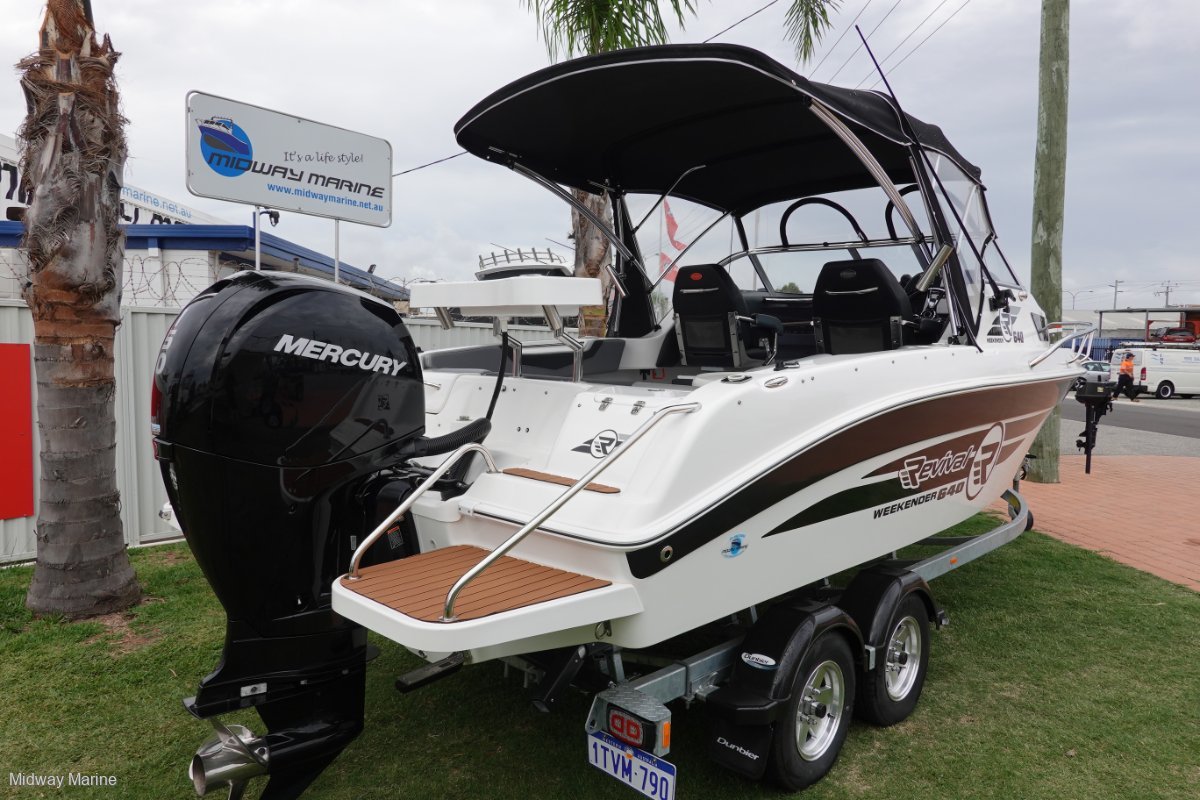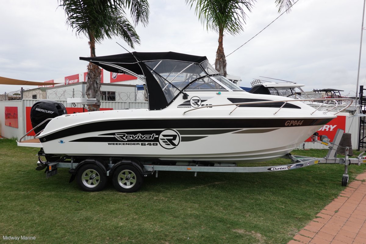 WOW! ONLY 18HOURS OF RUNNING WITH THIS 640 WEEKENDER. OWNER IS OFF CARAVANNING, SO THE BOATS GOTTA GO!. THE REVIVAL 640 WEEKENDER IS WA'S FAVOURITE 21 FOOTERGREAT FOR OVERNIGHT STAYS AT ROTTO, BIG BEAMY BOAT WITH GREAT A RIDE TO MATCH. THIS BOAT COMES WITH.... 150HP MERCURY 4ST, 18HOURSHYDRAULIC STEERINGDUAL BATTERIES100LTR WATER TANK WITH TRANSOM SHOWER AND SINK UNDER PASSENGER SEATBIG DLX HELMSMAN SEATSESKY SEAT FREAM AND ESKYCARPETED FLOOR AND SEA DECK PADS200LTR FUEL TANKBIG VEE BERTH THAT CONVERTS INTO A DOUBLE BEDTOILETREAR LOUNGE BOXES (REMOVABLE)REAR PLATFORMS AND S/S LADDERTABLEELECTRIC ANCHOR WINCH, ROPE, CHAIN AND SARCA ANCHORVHF RADIODLX BAIT BOARD12V/USB PLUGFUSION STEREO SYSTEMSIMRAD GO9 COMBO UNIT WITH CHART, 3IN1 TRANSDUCERSITS ON A DUAL AXLE DUNBIER TRAILER, WITH MAGS ALLOY WHEELSALL UNDER NEW WARRANTY STILL. ON DISPLAY NOW $87,000.00 FOR A QUICK SALE ! . MIDWAY MARINE43 HURRELL WAYROCKINGHAM WA9527 6963www. Midwaymarine. Net. AuCALL WARWICK OR MARTIN 0413 526 384OR COME INTO OUR YARD AND LOOK AT ALL OF OUR STOCK ON HANDWE ARE AGENTS FOR FISH HUNTER BOATS, REVIVAL BOATS, SEA JAY BOATS AND HAINES HUNTER BOATSWE SELL NEW AND USED BOATS, NEW MERCURY OUTBOARDS, DUNBIER AND MACKAY TRAILERS AND ALL THE PARTS YOU NEED FOR YOUR BOAT/MOTOR/TRAILERTRADE INS ARE WELCOME!WE SERVICE AND REPAIR ALL BRANDS OF MOTORSGEAR YOUR BOAT UP WITH RAYMARINE, SIMRAD, FUSION, GME OR LOWRANCE ELECTRONICSBIA MEMBERS AND BIA APPROVED REPAIRERINSURE YOUR BOAT WITH NAUTILUS MARINE INSURANCE OR CLUB MARINE INSURANCE, AGENTS FOR BOTHLIKE US ON FACEBOOK AND FOLLOW US ON INSTAGRAM