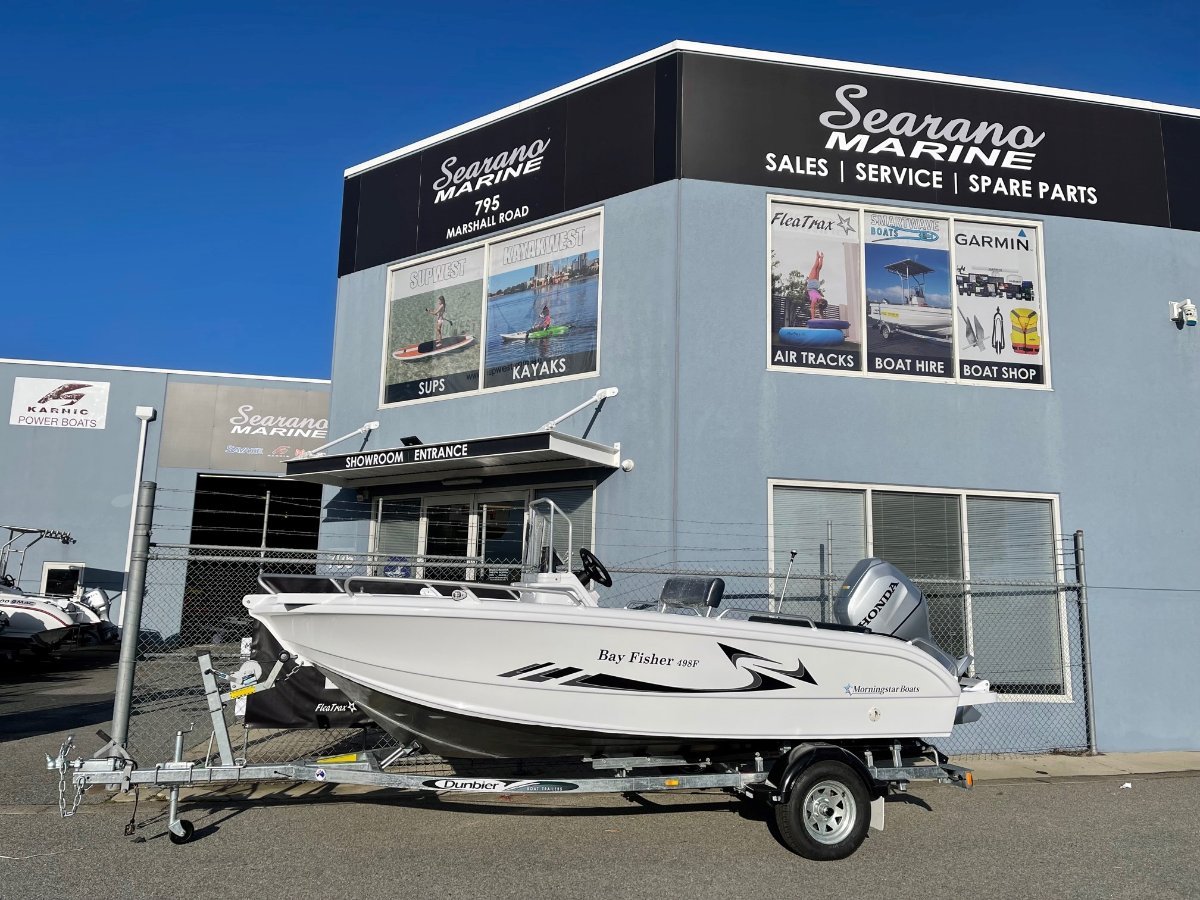 NEW 2022 MORNINGSTAR 498F PACKAGE IN STOCK AND READY TO GOThe classic Morningstar Bay Fisher 498F is designed for serious fishing. Putting the console in the centre provides a 360 degree fighting position. Under the skipper box seat there is not only a huge storage space but also a live well with a circulation system to keep your catches alive. The foldable bench at transom allows you to turn your fishing machine into a family boat in seconds. This package is fitted with a Honda BF80 Outboard and sitting on a Dunbier Loader Pro Trailer. Other features and inclusions;Garmin 95SV Sounder/GPS comboGME VHF radioHydraulic steeringLive bait tank Foldable rear seatSelf draining deck60L underfloor tank. Price includes 12 months rego and safety gear. Specifications;Boat Length : 4.98 MHull Beam : 2.0 MHull Height : 0.98 M(midship)Hull Weight : 408 KgMax Load : 750 KgMax Person : 5(450 Kg)Outboard Engine : 40-90 HPRecommended OB:60 HPUnder Floor Fuel Tank : 60 LFloatation : Basic