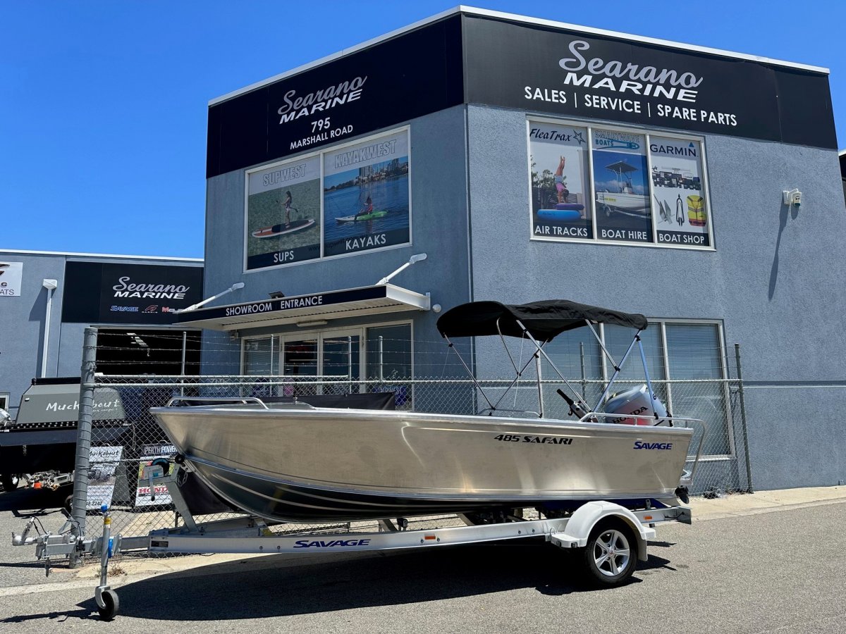 NEW PACKAGE IN STOCK NOW Price includes Honda BF60 outboard, Savage Alloy trailer, Fuel tank, Single battery, offshore flare kit and 12 months boat and trailer registration. You couldn't get a more versatile boat than the 485 Safari. This model is built to accommodate both leisurely fishing trips and days out exploring the vast waterways. Featuring tough plate side sheets, the 485 is a diverse model built to last. Factory optioned with the below -Side PocketsCarpeted floorsSide decks extrudedBiminiTransom step and railSPECIFICATIONSLength maximum: 4.85mLength of hull: 4.85mBeam: 2.05mBottom sides: 3.00mmTop sides: 2.50mmTransom material: 3.00mmTransom shaft length: L/SWeight (boat only): 270kgMax. HP: 60hpMax engine weight: 125kgNumber of people (basic): 5