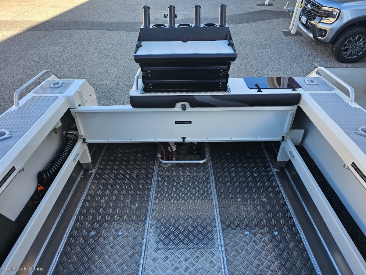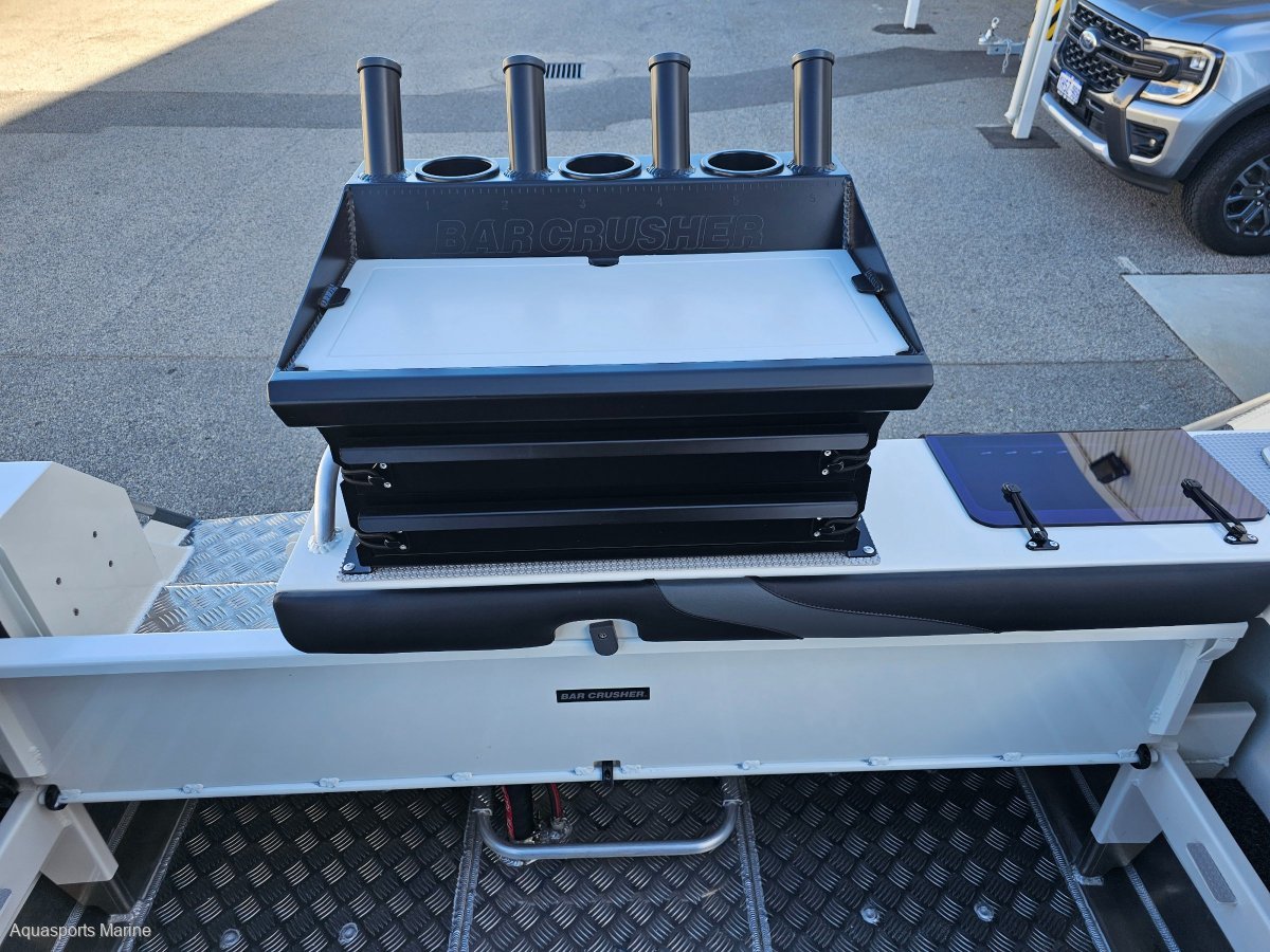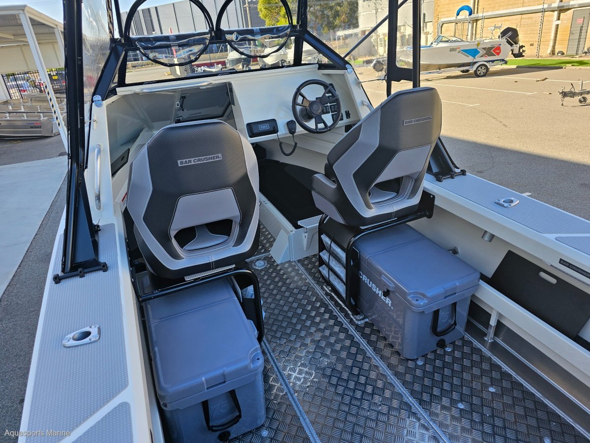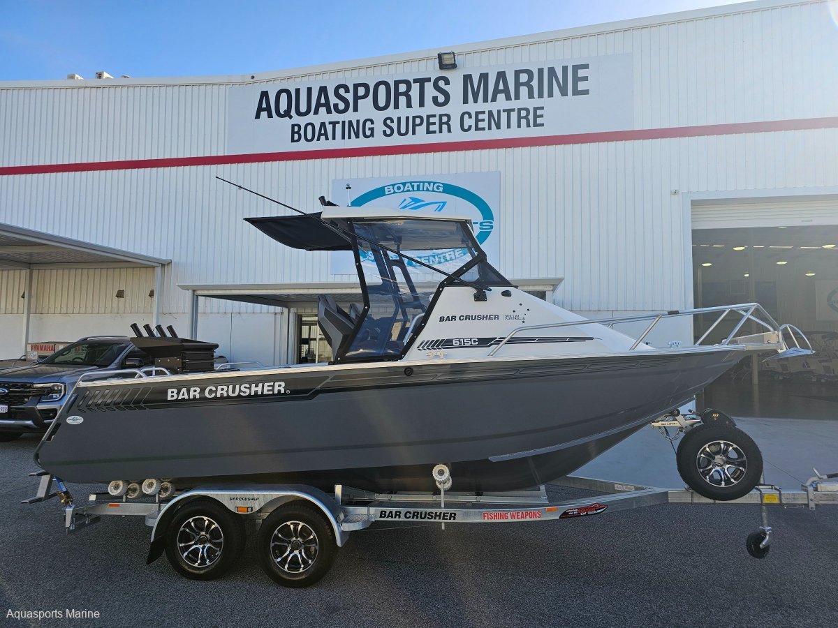 AVAILABLE TO ORDERPRICE WITH MERCURY 150hp EFI 4 STROKE with VESSEL VIEW 403 GAUGE AND STAINLESS PROP- OTHER YAMAHA AND MERCURY OPTIONS AVAIALABLEExtra Factory ordered options included:- MERCURY 150hp EFI 4 STROKE with VESSEL VIEW 403 DIGITAL GAUGE and STAINLESS PROP- EASYTOW GALVANISED DUAL AXLE TRAILER WITH SPARE TYRE UPGRADE FROM SINGLE AXLE- GME VHF RADIO- BALLAST FLAP WITH ACTUATOR - (FITTED)- BOW MOUNT ELECTRIC MOTOR BRACKET- DELUXE BAIT BOARD WITH DRAWERS- BUNK INFILL- SALTWATER DECK WASH 5.2GPM- TRIM TABS LECTRO TABS - (FITTED)- 2 x SIDE MOUNT BOLSTER SEAT WITH 3 TACKLE TRAYS with 2 x ESKYS- SOLID HULL COLOUR SATIN SHOCKWAVE BLUENB - Photos for Illustration purposes only, may include options not included in price. Bar Crusher 615C standard features include:- ANCHOR DECK FITTING, CLIP AND CORD- SARCA ANCHOR # 2- BAIT BOARD WITH INSERT AND DRAIN- LIVE BAIT TANK PLUMBING- PAINT WHITE- FOLDING GAS STRUT ROOF WITH CLEARS- ROCKET LAUNCHER FOR FOLDING ROOF- FRONT BUNKS 615C / 615HT FULL SET (3 CUSHIONS)- 2 x BOLSTER SEAT ON TACKLE BOX- 200L UNDERFLOOR FUEL TANK- 6 ALUMINIUM ROD HOLDERS- HYDRAULIC STEERING- DUAL BATTERIES- REAR FUEL FILLER- BURLEY BUCKETBrand New 2024 Model Bar Crusher 615C now available from Aquasports Marine, Perth's Complete Boating Centre. "We are excited to be the sole Bar Crusher dealer's for the great state of WA and we are now stocking an even greater range of these fishing weapons. We are here to help you with your new Bar Crusher research, so please, do not hesitate to contact us and see how we can help you get into one of these exciting offshore fishing rigs. Give us a call to find out about our easy finance options. "The 615C is an evolutionary version of one of the most popular models in its award-winning range. Designed for inshore and offshore fishing - and constructed from heavy duty, pre-stressed 4mm (bottom sides) and 4mm (top sides) marine grade plate aluminium - this versatile cuddy cabin model is widely acclaimed as the perfect all-round boat for Australian conditions. The 615C delivers an ultra-smooth ride thanks to the high-tech Waveslicer® non-pounding, deep-V hull, while the expertly-engineered Rigideck® sub-floor system ensures maximum hull strength. These two boats are extremely stable at rest, thanks to Bar Crusher's exclusive Quickflow® water ballast technology. The evolutionary Gen2(TM) hull design combines key features including a wider negative chine running forward, optimised wider chine aft and the distinctive Delta Flare(TM) - delivering greater hydrodynamic lift for more efficient planing and improved fuel economy, a higher bow attitude and better spray deflection for a drier ride, as well as increased stability at rest. Note the shape of the Delta Flare at the transom and the distinctive shape of the Quickflow® water ballast outlet. This innovation incorporates a cavity running the full length of the keel that quickly fills with water when the boat is stationary, which lowers the chines into the water for greater stability, and drains in seconds as the boat moves forward to allow it to leap effortlessly onto the plane. Onboard, the 615C's spacious cuddy cabin configuration and fold-away rear bench seat creates a large cockpit fishing area, the generous internal depth will ensure everyone feels secure when out on the water, while the Game Lock(TM) coaming creates a comfortable fish-fighting position. The functional helm station allows for installation of the latest large-screen marine electronics, and the fully-welded checker plate deck is extremely easy to clean after a solid day on the water. Strong aluminium rod holders, live bait tank with plumbing, berley bucket, large-volume storage pockets, rocket launcher, front clear, side clears, bait board, underfloor fuel tank, dual battery system, step through transom, tackle box seat bases, hydraulic steering are just some of the fishing-related features that come standard in these two boats. As with all models in cuddy cabin range, the 615C's folding Targa roof (with front and side clears) provides much-needed protection from the elements while on the water, yet when folded it reduces the on-trailer height to 2200mm for easy storage under carports and in low garages. The 615C is rated to carry between 115hp and 150hp and is built with a 200L fuel tank including easy access rear deck fuel fillerA huge cockpit fishing area, heavy-duty checker plate deck and extensive options list make these boats ideal for serious anglers who want an all round boat that can handle 20 knots of wind chop in the bay, extended offshore trips chasing game fish and family activities on the water such as towing biscuits, snorkeling and skiing. Every Bar Crusher boat is factory-packaged on a custom-designed trailer, which ensures towing, launching and retrieving is a breeze. Self-centering and aligning perfectly every time, the innovative Bar Catch(TM) system also allows for single-handed launch and retrieve. Package Price includes Factory Standard Features, EasyTow Dual Axel Trailer and Offshore Safety Kit. 12 Months Licensing and Registration included for Boat and Trailer (Stamp Duty Paid). Let us help you design your own rig, customise you boat with Bar Crushers extensive list of upgradesOutboard Options: Mercury and Yamaha Outboards Available!Electronics Available! We Supply and Fit Lowrance, Simrad and Raymarine at competitive prices!Have a chat with our friendly sales team today to find out more. TAGS: Barcrusher, Quintrex, Surtees, Fishhunter, Coraline, Chivers, Stabi, Custom.