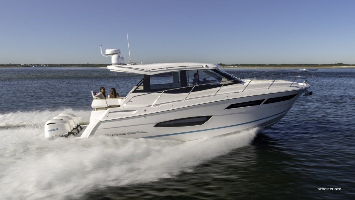 Saggers Marine proudly represents Regal Boats exclusively for Western Australia!Regal's 38 XO bridges the gap between our Sport Yacht and Outboard Series and creates a class of its own by combining luxury, innovation and the flexibility of outboard power. A slim, low-to-the-water platform features wings on both sides that wrap around the outboards while a step provides easy access across to either side, even with the outboards trimmed up. Enjoy adrenaline-charged performance delivered by Yamaha power and explicitly designed running surface. Slide open the enclosure doors and seamlessly blend the cockpit and salon by lowering the large window with just the push of a button then combine the galley with the outdoor refreshment center to serve as a versatile meal prep station. The spacious split head and shower fits two people while a California Queen bed, easy access on both sides, and an unheard amount of storage beneath, the forward stateroom not only raises the bar but is in a class of its own. KEY FEATURES:o NMMA, ABYC, USCG & CE Certifiedo Integrated Self Bailing Cockpit Systemo Automatic Fire Suppression Systemo Bow Thrustero Convenient Remote Main Battery Switcheso Dockside Fresh Water Hookup with Onboard Tank Fill Valveo Dockside Power - 50 ampo Electric Shore Cord Reelo Generatoro LED Indicating Trim Tab Controlso SeaStar SeaStation & SeaWayso Trim Tabso Two 16,000 BTU and One 27,000 BTU AC Unitso Weather Resistant Deutsch Connectorso Carbon Monoxide Detectoro Convertible King Size Bedo Twin Berthso Upholstered Headboardo 32" TVo Hidden Pocket Door System for Stateroom Privacyo Opening Deck Hatch with Privacy Screeno Standard Height Olympic Queen Bed with Innerspring Mattresso Under Bed Storageo Solid Surface Countertopo Teak Floor and Seat in Separate Showero Vessel Sinko Stainless Steel Stairway Railingo Aft Cockpit Grill Stationo Amtico Water Resistant Flooringo Courtesy Blue LED Lightso Expansive Glass Enclosure Doorso Fiberglass Cockpit Linero Fusion ANT Wireless Stereo Remoteo Hidden TVo L-Shaped Seatingo Salon Galleyo Seagrass Floor Coveringo Seamless Single Level Cockpit Soleo Stereo Performance Packageo Storage Under Aft Cockpit Seatingo Double Wide Helm Seat with Lift Up Bolstero Garmin VHF 100o Glass Cockpit Dash Systemo Premium Hand Wrapped Dasho Yamaha Binnacle Controlo Access Steps Port and Starboardo Anchor Windlasso Blue LED Underwater Lightingo Bow Chaise Loungers and Sunpado Foredeck Fender Locker Storageo Foredeck Wash Downo Large Transom Storage Lockero Lighter & Stronger Infusion Hull Constructiono Locking Transom Walk Through Dooro MarineTred Non-Skido Stainless 10" Deck Cleatso Stainless Deck Hardwareo Stainless Steel Bow Railo Stainless Steel Grab Rails for Foredeck Accesso Unique Transom Designo Foredeck Sun Lounge Covero Port and Starboard Windshield Wipers with WashersCALL US TODAY to check out options for this boat:o Engine Optionso Generator Optionso Technical Optionso Bedding Optionso Cabin Optionso Cabinetry Optionso Countertops Optionso Flooring - Atrium Optionso Flooring - Salon & Galley Optionso Sofa Fabric Optionso Bottom Paint Color Optionso Canvas Optionso Canvas Color Optionso Cockpit Optionso Cockpit Flooring Optionso Cockpit Upholstery Optionso Deck & Hull Optionso Transom Flooring Optionso Entertainment Optionso Navigation OptionsSPECSLOA: 12 MBeam: 3.6 MDry Weight: 9,525 KgsDeadrise: 18 degreesDraft - Drive Down: 0.97 MDraft - Drive Up: 0.64 MFuel Capacity: 1,363 LFresh Water: 208 LWaste Tank: 110 LGenerator Diesel Fuel Capacity: 106 LMax Capacity: CE 11Height - Drive down to light: 5 MHeight - Drive down to SAT dome: 4.6 MHeight - Drive down to Radar: 4.3 MBridge Clearance - Water To Hardtop Light: 4 MBridge Clearance - Water To Hardtop SAT Dome: 3.6 MBridge Clearance - Water To Hardtop Radar Dome: 3.4 M
