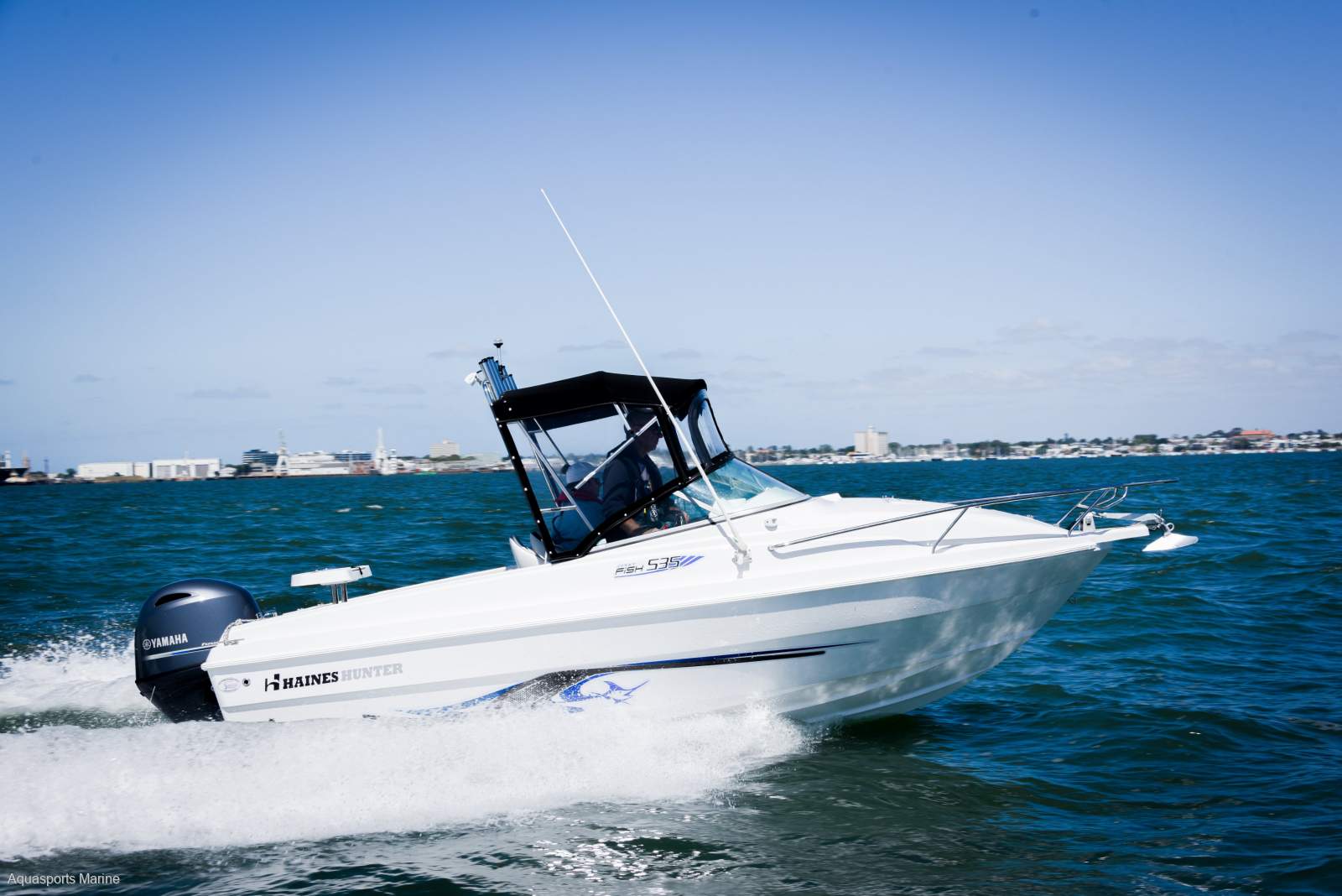 AVAILABLE TO ORDERGreat for fishing, you'll be able to go anywhere in this roomy yet affordable cuddy cabin. The 535 Sport Fish features the classic 21 degree deep vee deadrise hull that Haines Hunter is legendary for. In Action... It's clean lines are complemented by the Sport Fish decals. Rated to 130 horsepower and weighing approximately 650kg, this is a perfect platform for fishing, cruising and family fun. Room To Move... The 535 Sport Fish comes standard with a sports steering wheel, clip-in rear seats, recessed cockpit grab rails and cabin bunks with stowage. Plenty Of StorageThis model has been designed with a long freeboard, and the large cabin area allows you to escape the elements. Cabin ComfortThe Sport Fish range bucket seats with the Haines Hunter logo. Extra Factory ordered options included:- MERCURY 115hp 4 STROKE EFI (OTHER YAMAHA AND MERCURY OPTIONS AVAILABLE)- GME VHF RADIO AND AERIAL- BIMINI- FRONT AND SIDE CLEARS- SPARE WHEELHaines Hunter 535 Sportfish standard features include:Anchor HatchBilge PumpBow EyeBow Roller & BollardBow SpritCabin Bunks with Stowage LockersCockpit CarpetCockpit Side PocketsColour - Single Tone Hull & DeckCurved WindscreenDeck HatchDriver and Passenger Seat SlideMechanical SteeringNavigation LightsRear Bait Tanks x 2Rear CleatsRear Tow EyesRemovable Padded Quarter SeatsRod HoldersSwivel Bucket Seats on PedestalsUnderfloor Foam FlotationUnderfloor Fuel Tank with Deck Filler & BreathersUnderfloor Stowage LockerWaterproof Switch PanelBrand New 2025 Model Haines Hunter 535 Sportfish now available from Aquasports Marine, Perth's complete Boating Centre. "We are excited to be the sole Haines Hunter for the great state of WA and we will be stocking a huge range of these Australian legends. We are here to help you with your new Haines Hunter research, so please, do not hesitate to contact us and see how we can help you get into one of these exciting offshore fishing rigs. Give us a call to find out about our easy finance options. "Package Price includes Factory Standard Features, EasyTow Single Axle Steel Trailer and Offshore Safety Kit. 12 Months Licensing and Registration included for Boat and Trailer (Stamp Duty Paid). Let us help you design your own rig, customise you boat with Haines Hunter's extensive list of upgradesOutboard Options: Mercury and Yamaha Outboards Available!Electronics Available! We Supply and Fit Garmin, Lowrance, Simrad and Raymarine at competitive prices!Have a chat with our friendly sales team today to find out more. SPECIFICATIONSOverall Length - 5.35mHP Rating - 130HPOverall Beam - 2.2 mOverall Height - 1.92 mTransom Height Single - 25"Approx. Weight - 650 kgFuel Tank Capacity - Approx. 120 LitresNB - Photos for Illustration purposes only, may include options not included in price.