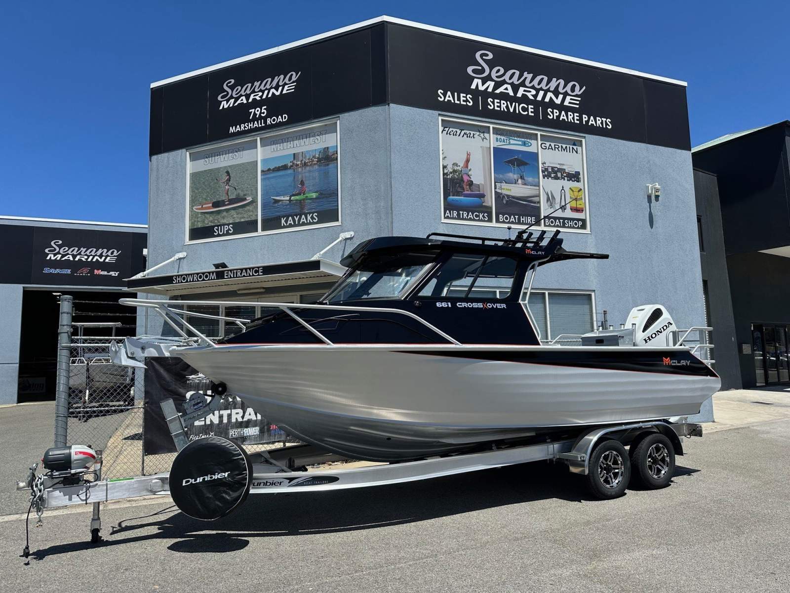 Mclays Flagship model in the mighty CrossXover range - The 661x Hard Top!It's all new from the water line up and has lots of new features not seen on McLay boats before. Still featuring the extra safety of having 100's of litres of buoyancy foam under the gunnels, this is now the largest boat in the CrossXover range. Wide gull wings for stability and a finer bow entry, gives this boat great stability at rest and a very soft ride. Also, this hull is much wider internally than previous models, giving a huge cockpit and having standard seating for 7 adults, gives the feel of a much larger boat than it is. With all this and much more we expect this boat to become our top selling CrossXover this year. This particular example has practically every factory option added to it. These Include;Lockable front cabinPlumbed toiletBunk infill cushionsRocket Launcher and extended rear shadeSavwinch anchor winchDeluxe sliding Bait Board with rod holdersSliding Bait board with Kill tank UnderneathPlumbed Live bait tank with perspex viewing panelDeck washRear cage ladder system on transom with 2 x folding ladders for accessUltralon flooringZipwakesFusion Apollo Stereo with 4 speakersVHF Marine radioDeluxe seats with drawers and storage pocketsUpgraded Transom rating Fitted with the latest Honda BF250 Drive-By-Wire engine in WHITEDunbier 3000kg Loader-Pro Aluminium TrailerPackage price - $167,990 Includes 12 months registration and safety gear. Other great features include;Side & top thickness - marine grade 4mmMarine grade 6mm chines (bottom)Welded 4mm tread plate floor giving underfloor buoyancyUnder floor Fuel Tank with sender - 220LFull length keel protection strip to protect bottomBow sprit with rope guidesFoam buoyancy gunnelsBuoyancy under rear platformsCabin hatchCabin shelvesLined cabin giving a pleasant tactile finishLined dash, hardtop & half deck, giving a pelasant tactile finishWelded alloy rod holdersHydraulic SteeringSliding wheelhouse windowsCabin windows (pair)Curved safety glass front windowLarge transom storage area with hatch coversLower oar / storage racksLarge glove boxKing Queen deluxe bolster seatsPadded squabs in cabin (pair)Fold up rear seatLive bait tank with Perspex windowWalk through transomPortofino style transomTwo platforms, handrails and ladderSelf draining anchor locker with hatch lidWater pick up pipe & tapFull bow railDash handrailRoof and deck handrailsHelm and passenger footstepsFront alloy bollard & 2 rear alloy cleats SpecificationsLength 6.65Bea m 2.33Freeboard 800 mmApproximate hull weight 1100 kgsTransom Height 25��HP Required 150-250