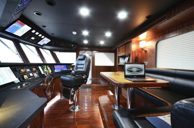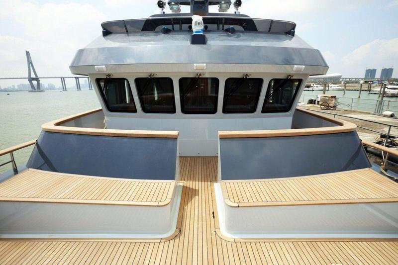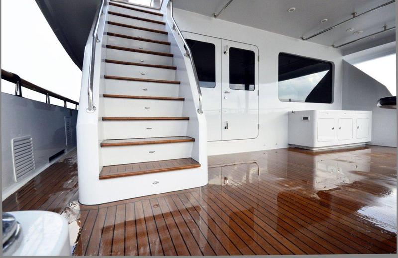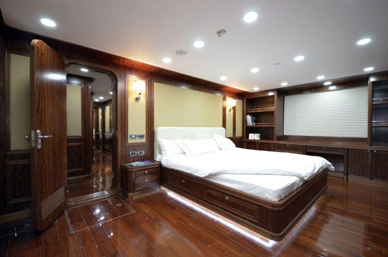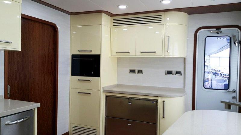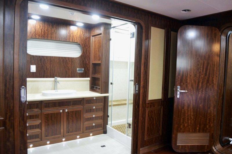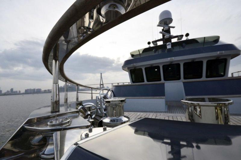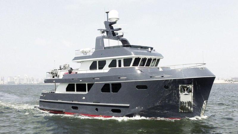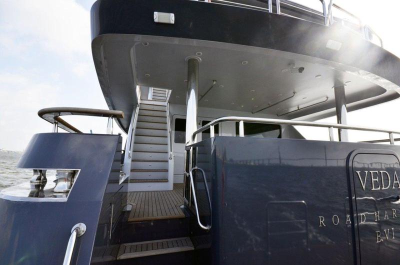 Bering Yachts Australia announces the successful launch of the Bering 80 "Veda". The full displacement steel yacht is currently the flagship of the Bering fleet and the fourth vessel in the Expedition Class series. Dressed in dark blue steel, the boat is the heaviest in her class, displacing 485,000 pounds (220 tons) and has a fuel capacity of over 12,885 gallons (48,775 liters). Her masculine blue/grey, crisp, and striking exterior is complemented by a classical rich Makore interior mixed with marbles, granite and hand-crafted furniture. Spacious, elegant and practical, Veda's massive 25-foot 8-inch (7.8 meters) beam gives her an immense amount of onboard space and the ability to comfortably accommodate eight guests in her four luxurious staterooms and four crew members, all with en-suite bathrooms. Veda�s interior design is timeless and benefits from exquisite craftsmanship, fine art and cutting-edge design. The main saloon is a large welcoming space; filled with natural light, hand-finished furnishings and state-of-the-art technology. The outstanding level of design and craftsmanship continues below deck, where both the owner�s stateroom and guest cabins offer privacy and extravagance in equal measure. She features cutting-edge noise and vibration insulation solutions, which the shipyard states will contribute to a relaxed and peaceful atmosphere on board. The vessel is fitted with a SidePower hydraulic stabilizer system making her stable and comfortable in all weather conditions.