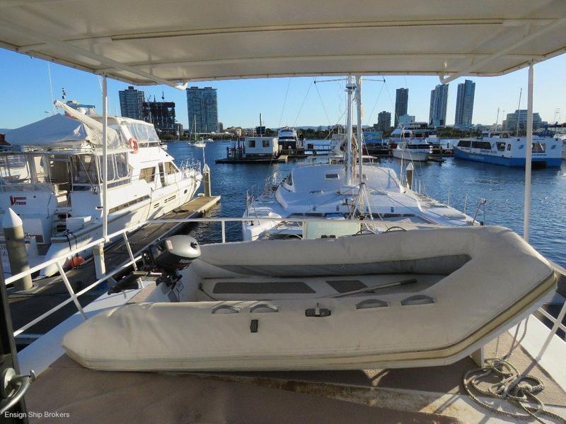Low maintenance bullet proof live aboard / coastal cruiser, Alloy build, Can sit on the sand, Flexiteak decks, Floating timber floors, Enclosed flybridge, Air conditioned, The list gos on. This 48 foot power catamaran built by renowned builder Rob Goode of Bundaberg, is a volumous and practical boat, with a warm interior andusable space. Built to ship building standards from Aluminium, this boat is strong and very easy to look after. Stable underway and at anchor you will sit back in comfort and watch the monohulls rock around as you enjoy your stable platform. For those of you looking for sleeping accommodation on the main deck, you will find this boat to meet your needs. The master has a full walk around bed, good hanging wardrobe space and is finished with warm wood tones. The second cabin offers a double with a single bunk above. The third cabin features over and under bunks. The galley has a breakfast bar and excellent bench space for food preparation, it interacts well with the huge dining table and saloon space. Ascend the stairs to the flybridge and you will be impressed with space. The helm has excellent vision and the twin engines set wide apart, allow for easy control of the vessel. The fully enclosed flybridge ample seating for 10, perfect for relaxing and it flows outside to the large flybridge aft deck. A unique sunshade extends or retracts over this space depending on your requirements. This flybridge aft deck is the perfect place to enjoy a cool drink and the view at the end of a good day out on the water. If you are looking for a low maintenance, easy to manoeuvre, spacious stable platform, with loads of space & stroage then this is the boat for you. Call today to arrange an inspection.EngineTwin Yamaha 150 (2006) FL150AETEngineHours320 hoursGensetHonda, 3 KvaFuelCapacity800 Litres (2 x 400 Litre Tanks)WaterCapacity800 Litres in four tanks (PVC)Weight12,000kgShowerYesToiletYes plus Holding TankAccomodationTOTAL BERTHS: 7