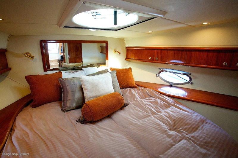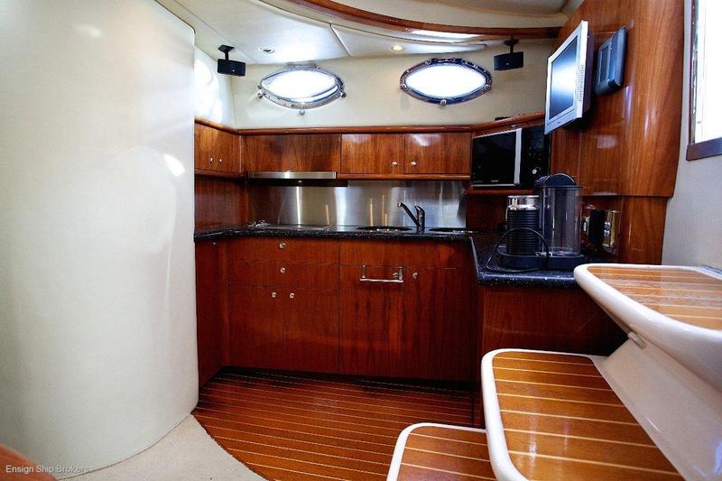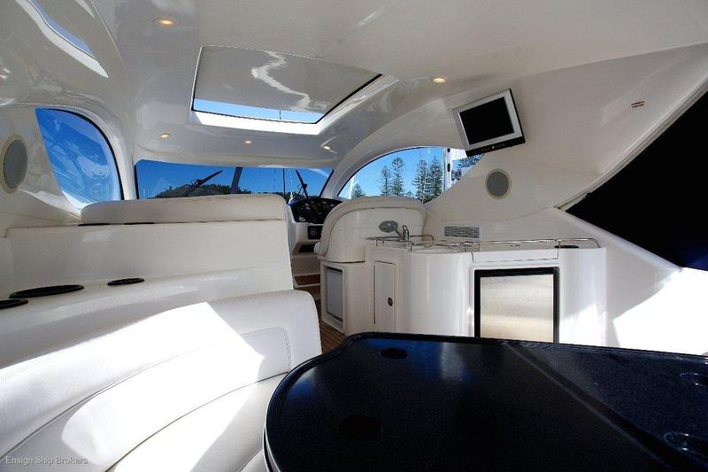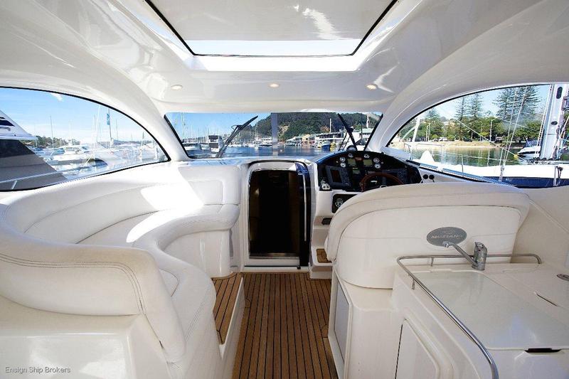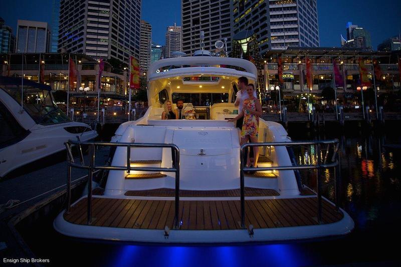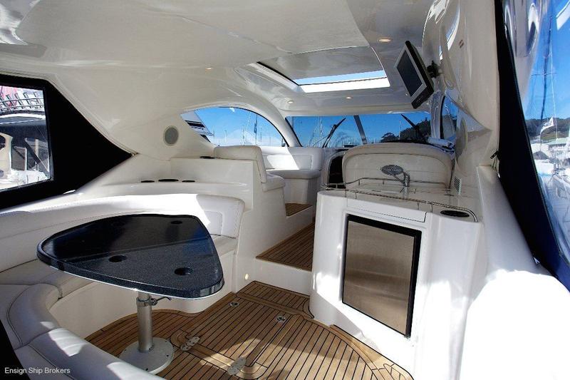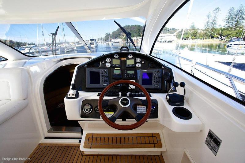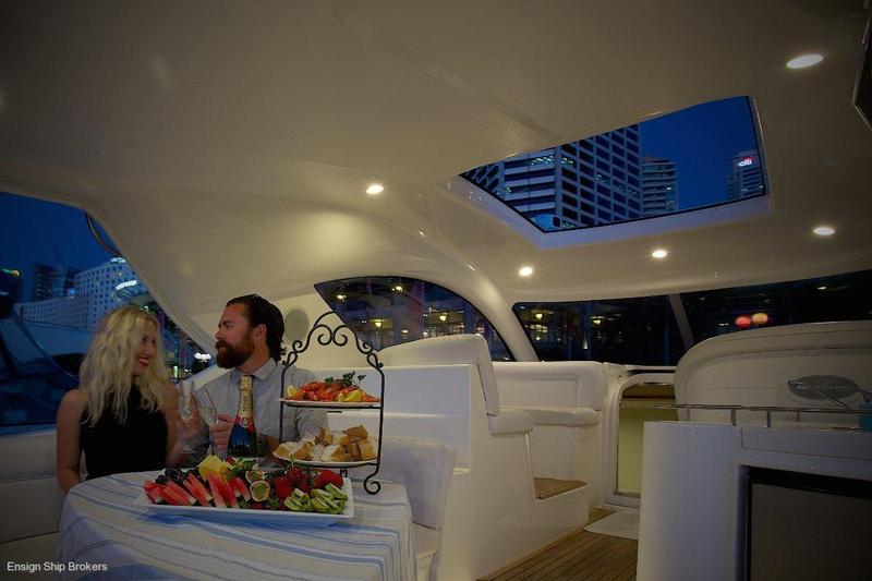 � Diesel IPS pod drives with joystick control � Hard top with Electric sunroof � Hydraulic swim platform � Generator and air conditioning � 2 cabins both with ensuite The IPS system allows for great control in the marina which means stress free parking whatever the wind is doing. The Volvo engines are well known for excellent handling and fuel efficiency. Huge social cockpit that will seat 10 people. A large hydraulic extended platform. Wide walk around on each side leading to the sunpad on the foredeck. Fusion sound system and flatscreen TV. Below deck are two spacious cabins and a feeling of space. A well proportioned saloon and galley at midships also contains the entertainment hub and boat systems. Both bathrooms have a separate shower stall and electric head. Exclusively available and on the marina at Ensign Sydney.EngineTwin Volvo IPS 500 Diesel 370 HP EnginesEngineHours800 hoursGensetKohler , 9.5 KvaFuelCapacity1,650 LitresWaterCapacity600 LitresWeight11,800 KgShower2Toilet2 x Electric plus Holding TankCoversAft closingAccomodationCABINS: Two double cabins with ensuite