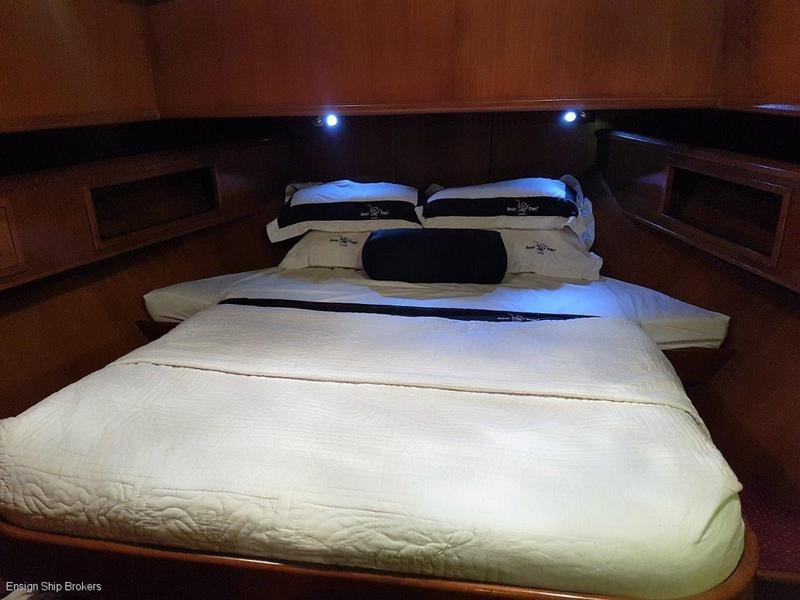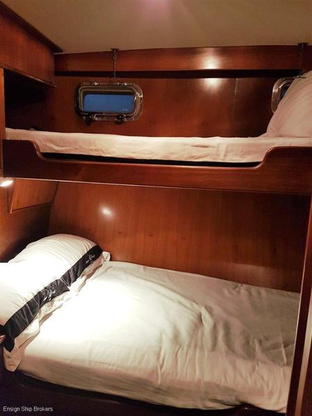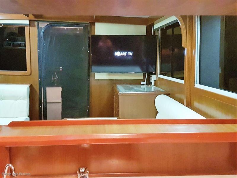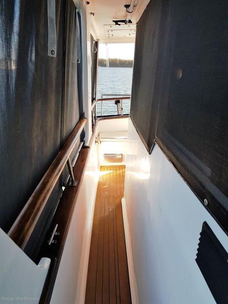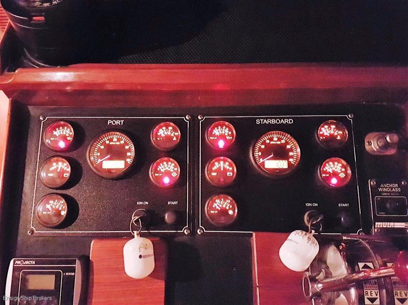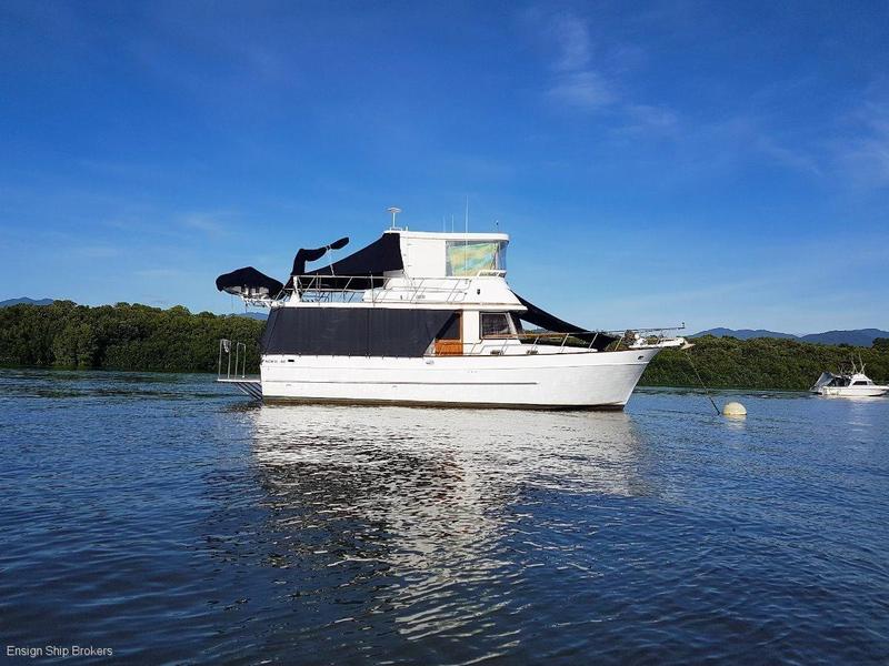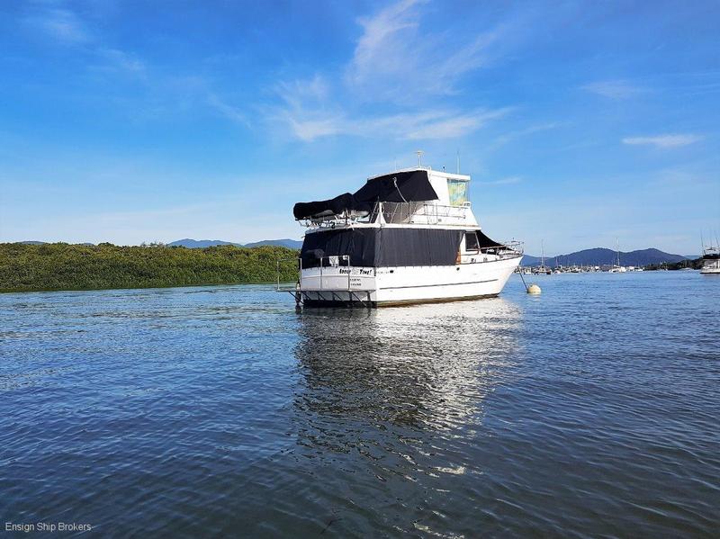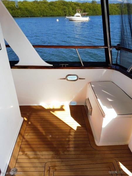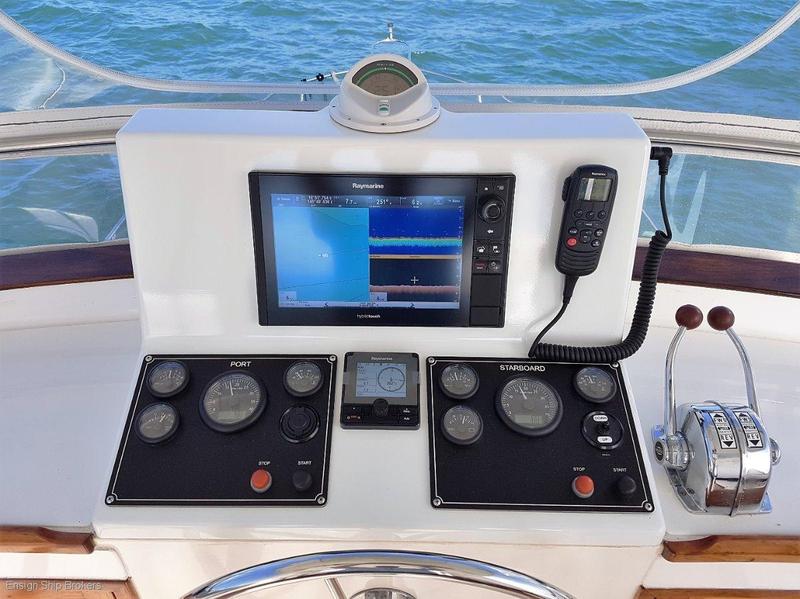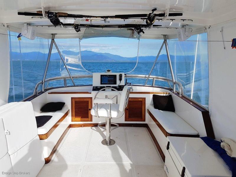 This beautifully appointed 40 foot flybridge cruiser has been immaculately maintained by the owner. It is well presented with full Aft covers. A bow cover also provides extra shade over fully customised cushioned ow area. There is a new rear awning for flybridge, Sunbrella fabric used for all covers. Flybridge has full clears and rear can fully enclosed. Flybridge has additional storage under seating. Remote controlled electric davit. The Aft has an additional 1 metre swim platform which also has a ladder that was commissioned for use when scuba diving. All upholstery is new. The interior is teak throughout, well appointed galley with electric cooktop and convection microwave, twin sink. Waco 200 litre fridge and 200 litre freezer. 45 inch Samsung smart TV (2016). Fully equipped electric toilet, full shower and basin, bathroom has extra storage. There is one master bedroom and twin beds in second cabin. Wardrobes and additional storage throughout. A stainless steel gas BBQ on AFT deck. This Cummins twin engine vessel is very economical to run, 18 Litres per hour at 8 knots, fuel tanks hold 1800 litres. New upgrades of all electronics and navigational instruments, all Raymarine products, including auto pilot and 12 1/2 inch touch screen monitor. All instrumentation has been upgraded. Raymarine UHF radio and GME UHF radio. Full Fusion sound system throughout the vessel. All can controlled remotely or from upper and lower helm. All Raymarine and Fusion systems can be operated from any Android or Apple equipment. A 1000 watt, 12v to 240v Projecta Inverter. Solar system installed with 3 x 125w panels and a Victron Blue Solar charger controller. New Enerdrive 240v to 12v 3 bank battery charger, runs on shore power or genset. Genset 7 KVA-Kobota engine/Dunlight alternator. 240v hot water service, can also be heated by port engine. Tectra/San sewage treatment system. Filtered drinking water system. Stella Water Maker, 120 litres per hour with storage of 400 litres of water. Dripless shaft seals. All engine mounts rand raw water pumps recently replaced. New 4 blade propellers and shaft bushings (2015). Muir anchor winch - controlled at upper or lower helm and on bow. 1600 BTU air conditioning throughout vessel. Steering gear compartment has ample storage, including dive bottle rack. The tender is a 2015 inflatable Sirocco, with aluminium floor, custom Sunbrella covers. Yamaha 4 stroke 2.5hp. Multiple rod holders and racks. 2x Kayaks, 11 1/2 foot paddle board - fully covered. All safety equipment onboard. Many extras. Just been cleaned polished and anitifouled and propellers and rudders have had been coated with a silicon coating.