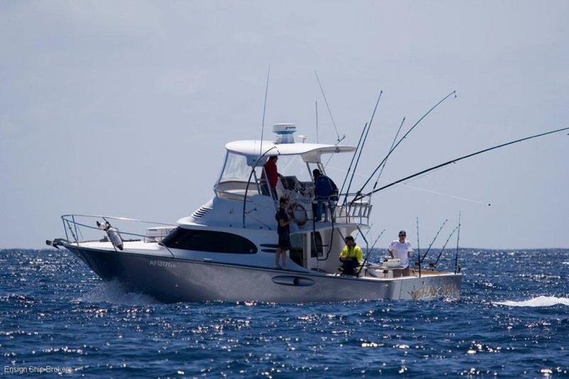 Extracts from Bluewater Magazine and Boating Queensland best describe this amazing game boat. If you have spent time around game boats, names such as Mauna Kea & Inkwazi are sure to get your attention. These are some of the finest craft ever to ply our waters. The one thing in common with all these custom boats is that they were all designed by David Pleysier, who has long been considered at the forefront of game boat design. To enthusiasts �Pleysier� represent the �state of the art in game-fishing vessels� both in quality of build & their sea handling. One of the last designs David drew was the 11.4 meter �Shakara�, at first glance she does not look like a classic Pleysier. Whilst the tried & proven hull remains the same, the super structure looks much more modern, with smooth flowing lines and wrap around cabin structure. Shakara`s soft ride into a seaway, light footed manoeuvrability when chasing game fish in both forward & reverse, plus the fuel economy are quite simply �remarkable. Not surprising when you have a fully loaded weight of 7 tonnes, achieved through the extensive use of beautifully crafted triple diagonally planked Australian Red Cedar in her hull, laminated and sheathed in E-glass by a team of the finest shipwrights in SE Queensland, offering both protection to the hull but also a beautiful finish. The cockpit area is amazing, lift up engine boxes for easy access when inspecting or servicing her motors, also offer a great area for crew to watch baits & teasers, whilst being out of the sun. There is ample room for a Heavy Tackle 130 lb game chair, which is included. Plus, the right height gunwales to give the stand- up tackle angler great support when fighting a fish. All corners are softly radiused & rounded so there are no sharp corners to injure yourself on. A test run, on this amazing game boat & you will be truly impressed. Call Ensign Pittwater Office today!