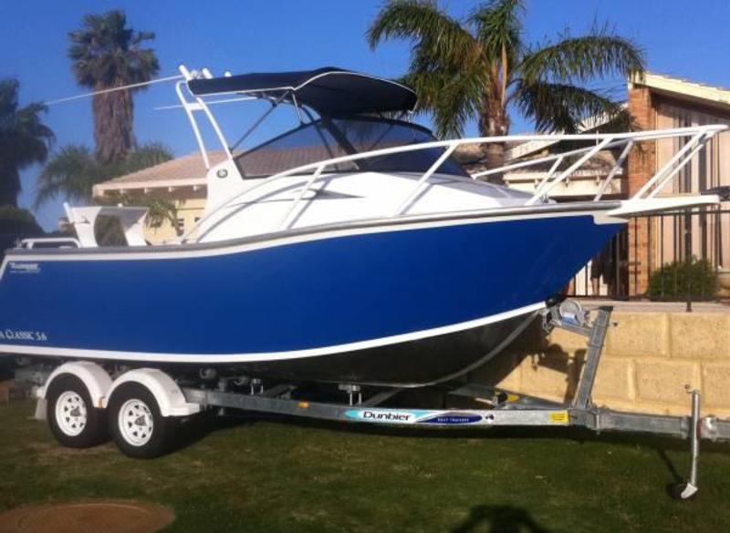 Razerline 5.6 W. A. Classic This compact off shore boat has it all self draing deck full size frames below deck and foam flotation, 100 hp Yamaha outboard, Tandem axle trailer, Catch tank, Bait board, Aft battery cabinet, Deck wash, Carpet deck, Bilge pump, Heavy duty ladder, Side pockets, Built in seat boxes with storage, eperb and fire extinguisher recesses, Hydraulic steering, CD player, 27 Meg radio, Bimini
