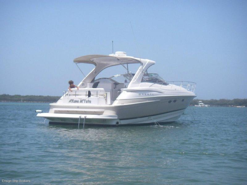 2006 Regal 4460 HARDTOP 44.7 foot cruiser with only 360 hours. The king of the Regal royal family of sport yachts. Fully optioned, bow and stern thruster, three aircons, inc cockpit, ice maker, new clears and cockpit cover, full service history, Genset. The 4460 Commodore is a sophisticated express cruiser , has one of the best cockpits I�ve ever seen with the boat delivering all round luxury and performance!. � washer/ dryer. � 3 x TV .& upgraded sound system in cockpit. surround sound in cabin. � Two E120 plus radar/ fishfinder and talks to smartcraft engines. � Twin Mercruiser 420hp 8.1 with V-drives. � Bow & Stern Thruster. � 7 KW Kohler Generator. � 7' Headroom. � Reverse cycle 3 zone air conditioning. � Ducted vacuuming. � Blue Underwater Lights. � Bridge clearance 10�6�- 3.23m. Immaculately presented, this boat has every option and the owner will trade! So Make an offer! Call or drop in and inspect this vessel on our docks at Mariners Cove, Gold Coast ,QLD. She has a large U-shaped lounge just across from the extra wide helm, but there�s an aft lounge as well directly opposite the transom with huge sun pad and storage. The helm has a great layout of full instrumentation, gauges, controls, and electronics. The electric double bench helm seat provides comfort either sitting or standing. There�s a large sun pad up front that has flip up backrests. Down below, you�ll be dazzled by her design and beauty of the interior. To starboard is a superbly designed galley with Corian counter tops and all the modern conveniences that comes with ample storage. Opposite the galley is a plush 9-foot leather lounge complimenting the Italian wood table. There is an excellent entertainment package including a flat screen televisions connected to the surround sound system in the saloon. Forward is the master stateroom complete with an extra large berth and the master en-suite features a full shower stall, vanity, vacuflush head. The guest stateroom is aft and separated by a wood door and features twin single berths that easily convert to one large queen with its own ensuite.EngineTwin MerCruiser 420HPEngineHours360 HoursGensetKohler, 7 KvaFuelCapacity1,154 LitresWaterCapacity382 LitresWeight9,979 KgShowerTwoToiletTwo plus Holding TankCoversFull covers and clearsAccomodationCABINS: Two