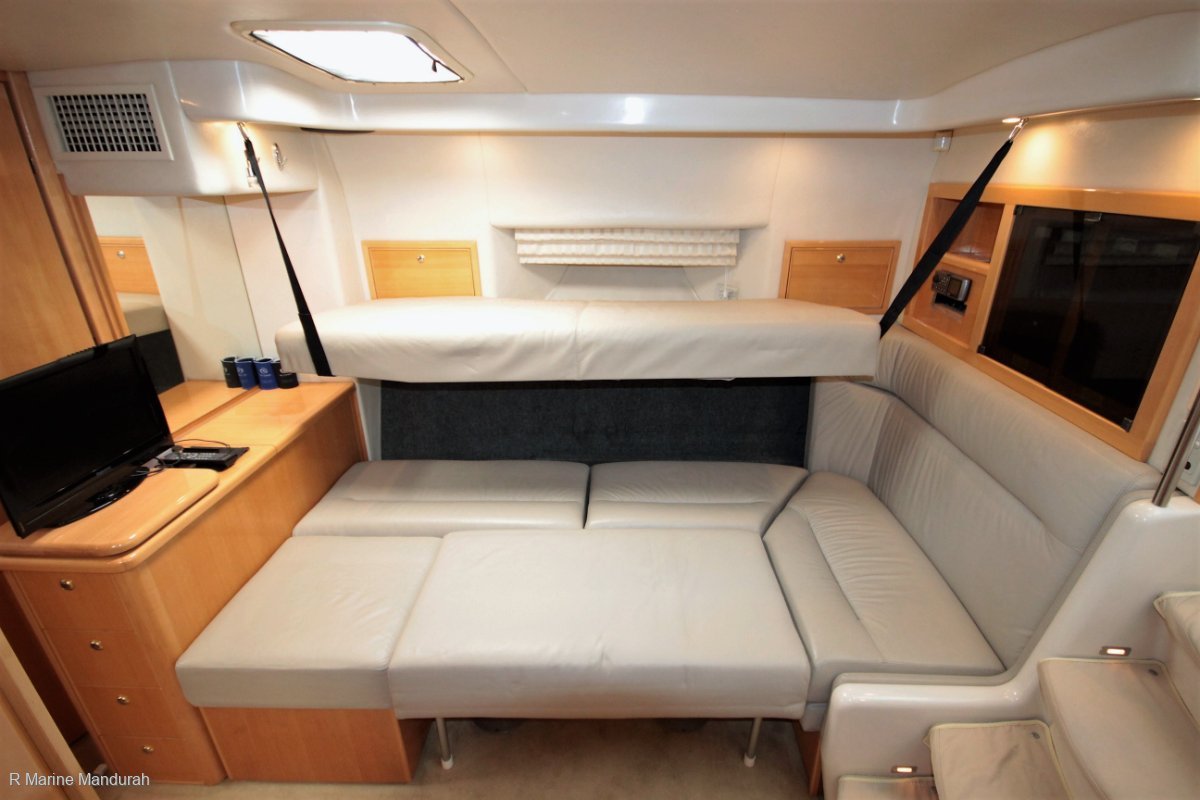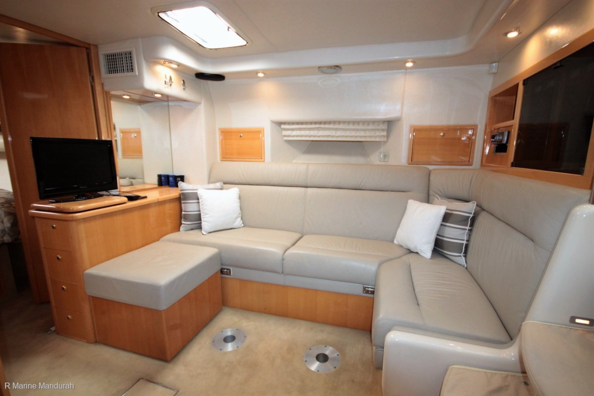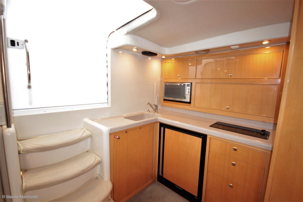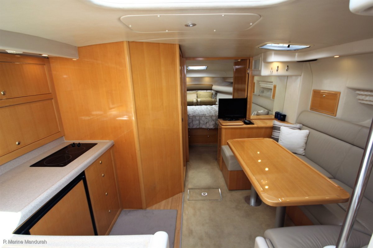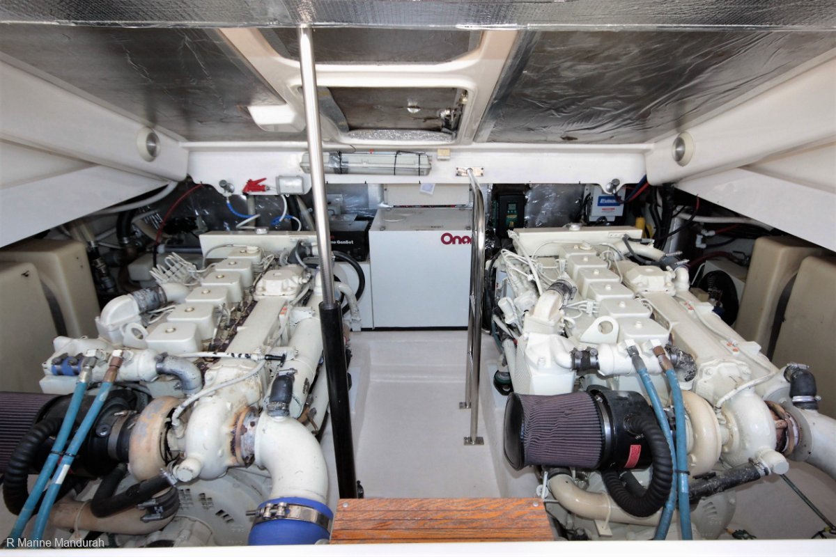 R Marine Mandurah is again pleased to bring another well sort after Riviera to the WA market. The ever popular Riviera 4000 Offshore, a family favourite and a much sort after boat with nearly 250 coming through the factory in QLD. The Riviera 4000 Offshore was one of the most popular boats Riviera has built. Feature packed for the family including a hydraulic swim platform with a 400 kg rating. Once aboard you are met with the normal expansive teak cockpit, Riv tech cool box and fridge. Plenty of room for the fisherman and entertainer alike. A small step up adjacent to the aft sink leads you into the raised helm mezzanine and lounge area. Room for the whole family to spread out in comfort and a well laid out helm with comfortable seating for those longer trips with Raymarine Sounder, GPS and Auto pilot. Great vision and plenty of protection over head. A pleasure to drive. Centrally located the opaque cabin door allows filtered light through into the cabin and easy access through to the main cabin. Finished in a light beech timber finish and neutral leather upholstery she looks light and airy with a feeling of space around you. A master cabin forward with a solid cabin door for privacy, a large L shaped leather lounge to Starboard converting to a double and bunk single above, a very functional Galley to port and a generous head with separate shower to Port with the door facing the Starboard side, the preferred style. Neat and tidy with Cruiseair AC unit she has been well kept. Access to the Cummins 6BTA-5.9,370 Hp Diesel engines is via a mezzanine hatch or by lifting the mezzanine area on electric rams. Sensational access for your tech for servicing and maintenance. Showing just 900 hours at the time of listing this engine bay shows signs of excellent maintenance, not a thing out of place. Ships power offered through the Onan 6.5Kva genset with under 1000 hours of use. Recent works :Serviced July 2019Genset serviced July 2019Anti-fouled July 2019Prop - Speed July 2019Acid bathed coolers 2019Call the office on 08 9583 5355, Paul on 0427949293 or Trevor on 0456 949 293 We are here to help and will be happy to arrange a suitable time to look over the Riviera 4000 OffshoreIf you considering selling a similar boat we cater to owners from Busselton to Mindarie and everywhere in between. List your boat with R Marine Mandurah and maximise your boats exposure. With a lifetime invested in the WA Marine Industry at all levels and thousands of boats sold Paul Denboer, Trevor Parkins and the team at R Marine Mandurah WILL sell your boat and are proud to offer a NO SALE NO FEE structure to all our valued clients. Why entrust your precious boat to just anyone !R Marine Mandurah, Experience the difference for yourself, see why our clients are speaking so highly of the R Marine Mandurah Team.