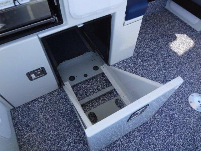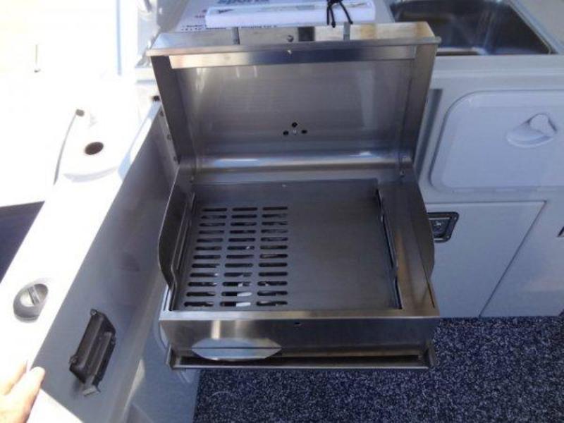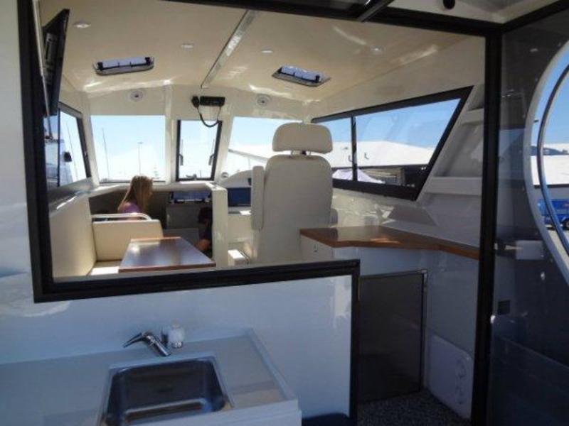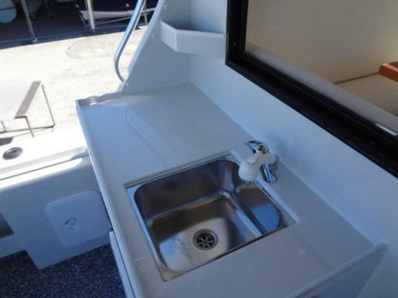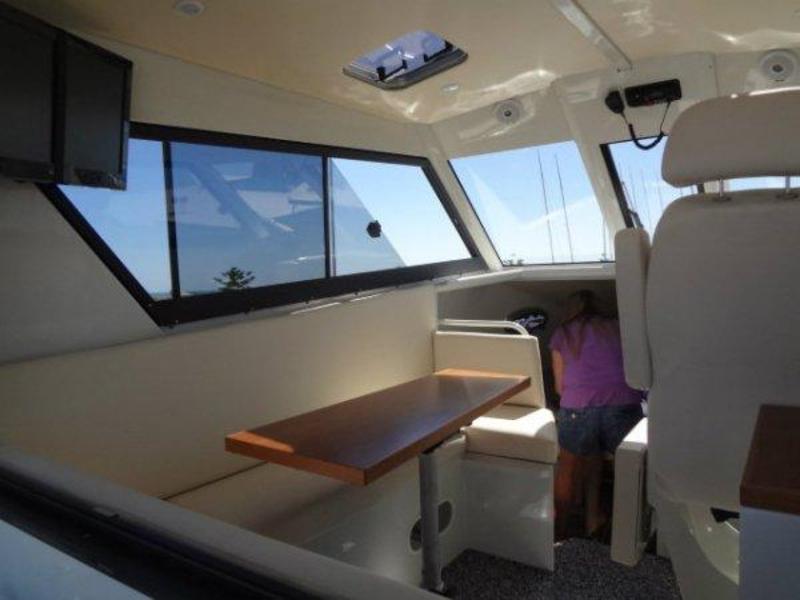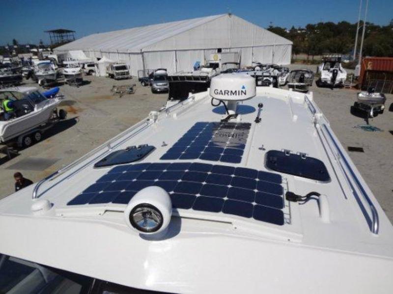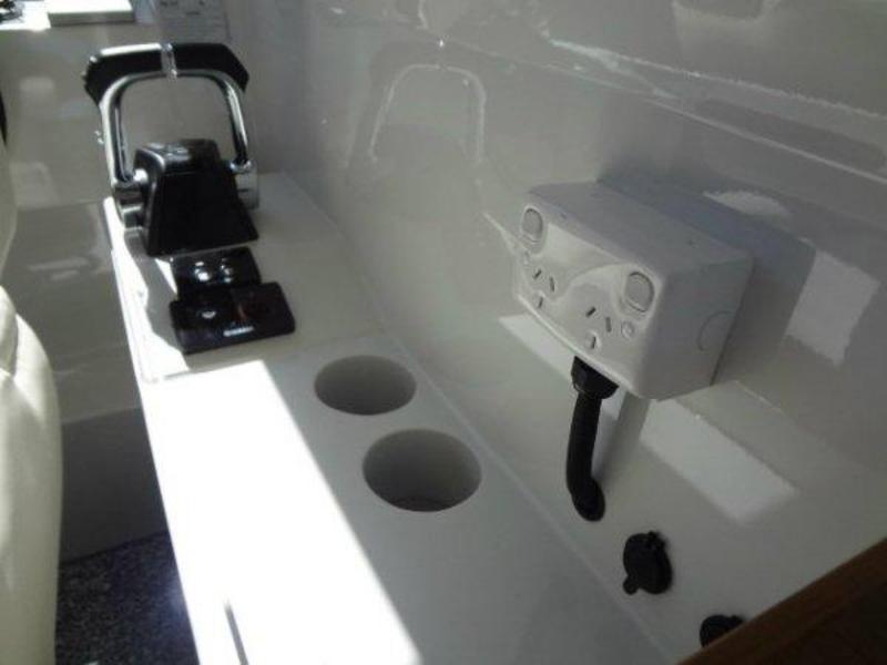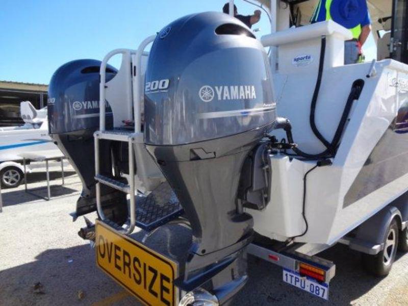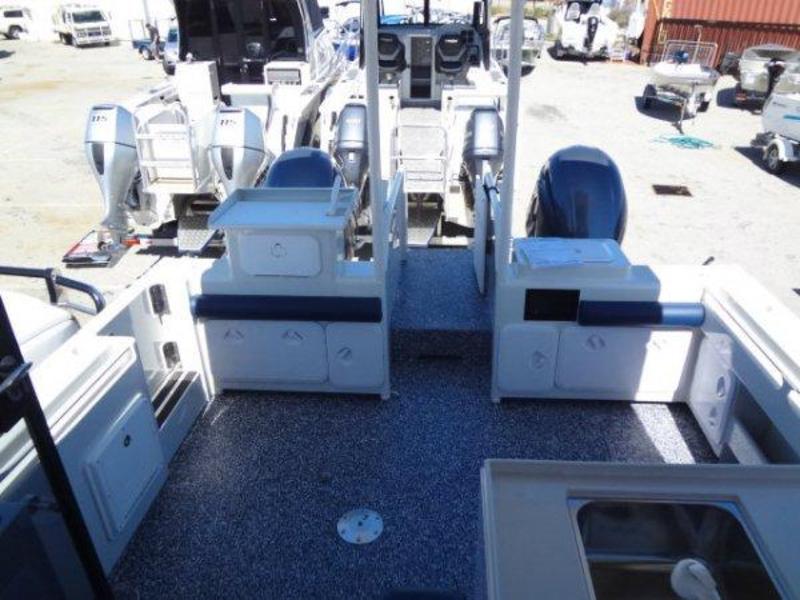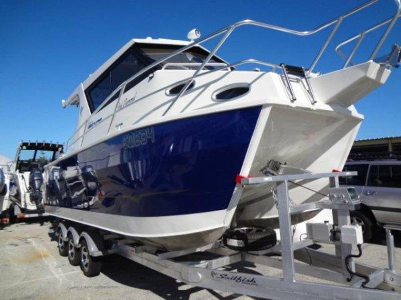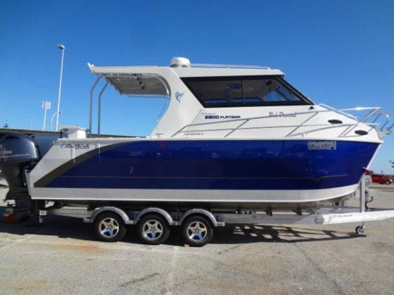 This is a magnificent example of the Sailfish 2800 2.8m beam Platinum series Catamaran that has been custom built for a Pilbara client. It shows examples of how these and other sailfish models can be customised to meet individual needs. The base model boat is a very well appointed vessel and this version has an extensive list of options including full hard top, radar, 2 x 12" Garmin screens, auto pilot, solar power, air conditioning, 12-240volt inverter, 700L fuel, 200L fresh water, HWS, camper covers, sleeping for 5, fridge slide, built in fridge, s/s slide out BBQ, cafe style seating, the list goes on. Powered by 200hp Yamaha 4 stoke engines with Digital Electronic Controls it has a top speed of 40 knots! Power to burn and extremely quiet running along with great fuel economy. Storage options are endless with every usable space being fitted with creative storage systems and cavities. Tackle drawers and flip out boxes allow for your gear to readily available yet stored out of the way. Innovative rod storage tubes fitted to the roof are a great addition to keep rods safely stored. If this boat wets your appetite get in touch with us at Sportsmarine to see more images and to find out more about the standard specification and options.