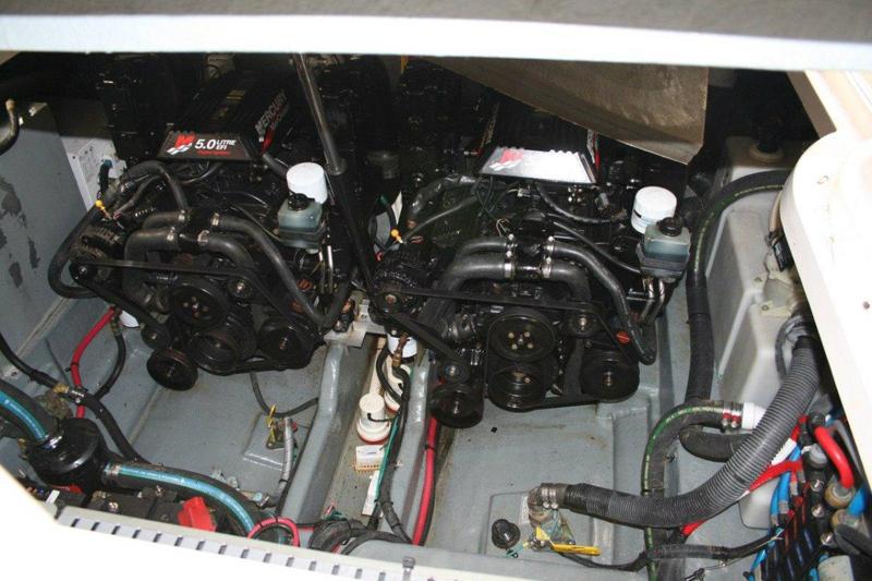 An exceptional example of this ever popular Sundance model with Pride of Ownership evident throughout the vessel. Highlights include a very roomy cockpit with front facing stern seats with fold away table, burlwood console with navigation electronics, a double companion helm seat, and a cockpit fridge, sink, and swim platform with davits, BBQ and full camper canopy with excellent clears. Below deck accommodation is luxuriously fitted out with leather upholstery, built in TV/DVD, well fitted out galley, highlighted by hi gloss cabinetry. Separate electric head with shower. Engine access by way of electric lift hatch in cockpit housing twin 5.0t EFI MerCruisers, with only 390 hours and generator.