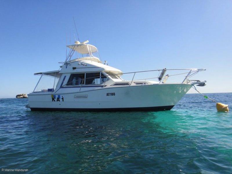 REDUCED, THIS BOAT MUST SELL........ This classic Australian built boat is an outstanding entry point into the WA boating lifestyle. Imagine lounging on the deck while the kids snorkel the crystal clear bays of Rottnest, what better a life is there. With room for the young family the boat offers a large forward cabin that can be converted into a four bunk arrangement along with sleeping options in the saloon the boat could sleep 6 or more comfortably. Currently undergone a minor refit internally the saloon through to FWD cabin now sports new specially ordered carpets and fresh upholstery on the starboard lounge. A large step down port side galley with a micro, stove and a gas oven suitable for a Xmas turkey, the holiday seasons are yours for the taking. Presenting your family at their finest is a breeze in the oversized toilet and shower. Ive seen smaller bathrooms in hotel rooms !Teak teak teak.. There is teak in the cockpit, on the swim platform and up on the flybridge. The initial owner of this vessel spared no expense at the time. Twin stations with a traditional timber feel to the lower helm and saloon, coupled with the standard features you would expect on the flybridge, GPS, VHF and 27MHz radio and a remote spotlight to extend the use of the boat. Twin Volvo Penta shaft driven engines offer excellent range and reliability. Servicing annually has been of the up most importance to the current owner. Slipped Oct 2016 for servicing, anti-fouling and hull polish. The hard jobs are done for the next year. This is an excellent opportunity to get that Rotto feeling this summer without having to break the bank. Do you remember the Americas cup in Fremantle in 1987. Do you remember the defence boats number.. KA1. Could this be a part of Australian sailing history ? Only the boat would know. R marine Mandurah sales service and spares for all makes and models.