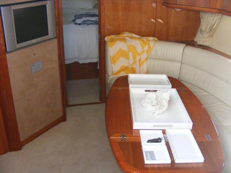Launched in 2004 this is an exceptional boat. There was no compromising when it came to ticking the boxes for this particular vessel. Arguably the best on the market this Portofino 46 features: � Upgraded 3126 Caterpillar shaft drive engines � 6.5 KVA Kholer genset � Desalinater � Bow thruster � Raymarine electronics � Hydraulic swim platform � Avon fibreglass inflatable tender with Yamaha 15 HP outboard The cockpit features a great wet bar with fridges, ice-maker, and BBQ, not to mention an abundance of lounges to choose from, with further seating adjacent to the helm which really compliments the driver when under way. Moving below deck this boat features a 2 cabin layout with forward owners cabin with en suit and an aft 2x single bed cabin with en suite also. The galley positioned to port is functional, open and features everything needed to cater for guests. Opposite the galley is the saloon lounge with a lowerable table converting to an additional berth should it be required. The saloon, owners cabin and guest cabin all feature home theatre, flat screen entertainment systems which can be enjoyed in great comfort thanks to climate controlled reverse cycle air conditioning. The Sunseeker 46' Portofino is quite simply the benchmark sports cruiser sub 50 foot. This vessel is priced to sell so waste no time in arranging a viewing at Ensign Sydney.EngineTwin Caterpillar 3126EngineHoursPort: 585 Hours / Starboard: 595 HoursGensetKohler, 6.5 KvaFuelCapacity1,309 LitresWeight14,651 KgShower2x EnsuiteToilet2x Ensuite plus Holding TankDinghyAvonOutboard15HP YamahaCoversNEW (2014)AccomodationCABINS: 2x Master double forward / Twin single midship<br>TOTAL BERTHS: 5<br>SALOON: Saloon lounge with lowerable table<br>SHOWER: 2x EnsuiteGalleyLAYOUT: To Port<br>STORAGE: Yes<br>STOVE TYPE: Ceramic 2-Burner<br>MICROWAVE: PanasonicRefrigerationFRIDGE: Yes<br>FREEZER: YesGroundTackleANCHOR WINCH: Yes<br>REMOTE: Yes + Counter<br>ANCHOR: Yes<br>CHAIN: YesSafetyGearBILGE PUMPS: 2<br>SPOTLIGHT: YesElectricsLIGHTING: 12v<br>SHORE POWER: 240v<br>INVERTER: Yes<br>ElectronicsGPS: Raymarine C120<br>PLOTTER: Raymairne C120<br>SOUNDER: Raymarine C120<br>RADAR: Raymarine <br>AUTO PILOT: Raymarine ST60<br>DeckGearHydraulic Platform